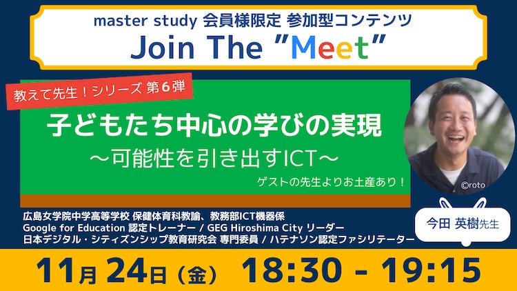 月2回、金曜日の18:30~19:00に Google Meet™ で開催中の「Join The “Meet”」。『教えて先生!シリーズ』は、特別回として15分拡大バージョン【18:30~19:15】でお送りします!