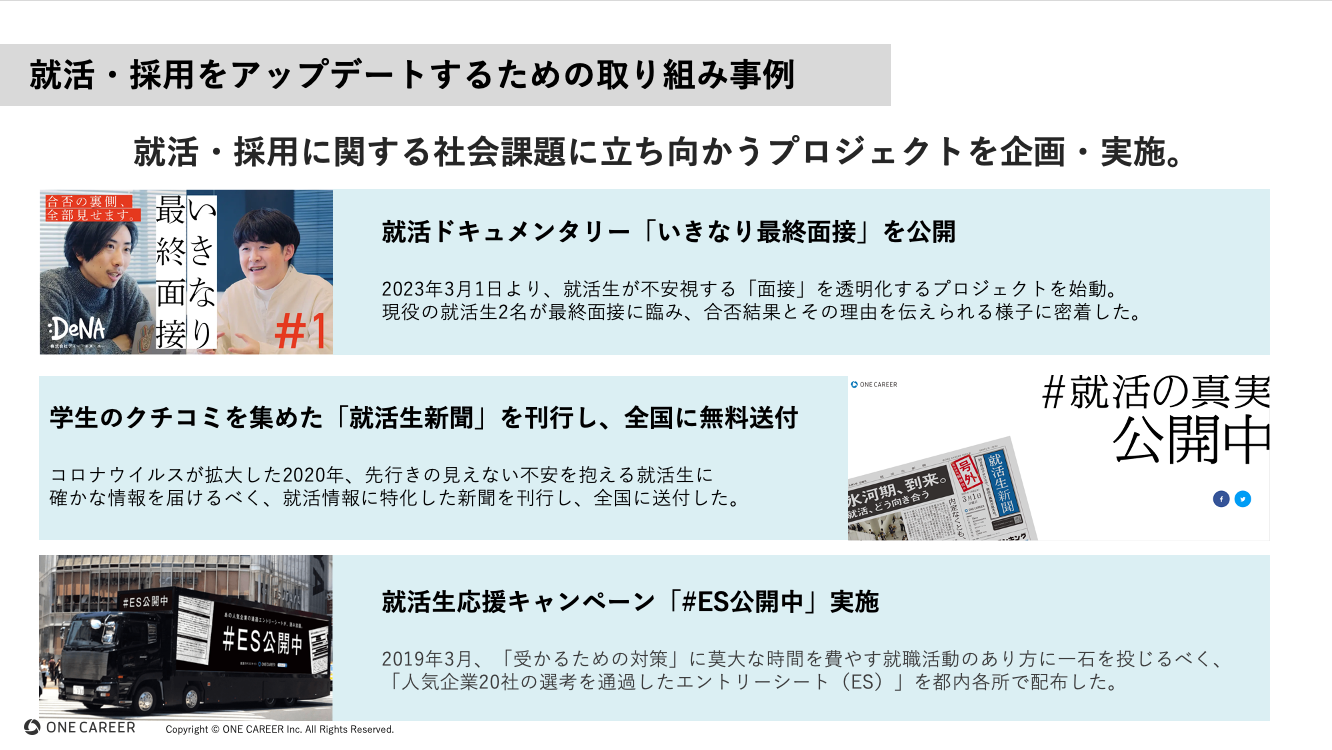 2023年3⽉1⽇より、就活⽣が不安視する「⾯接」を透明化するプロジェクトを始動。就活中の学⽣がいきなり最終⾯接に挑む就活ドキュメンタリー「いきなり最終⾯接」を公開し、多くの反響をいただきました(※2)。