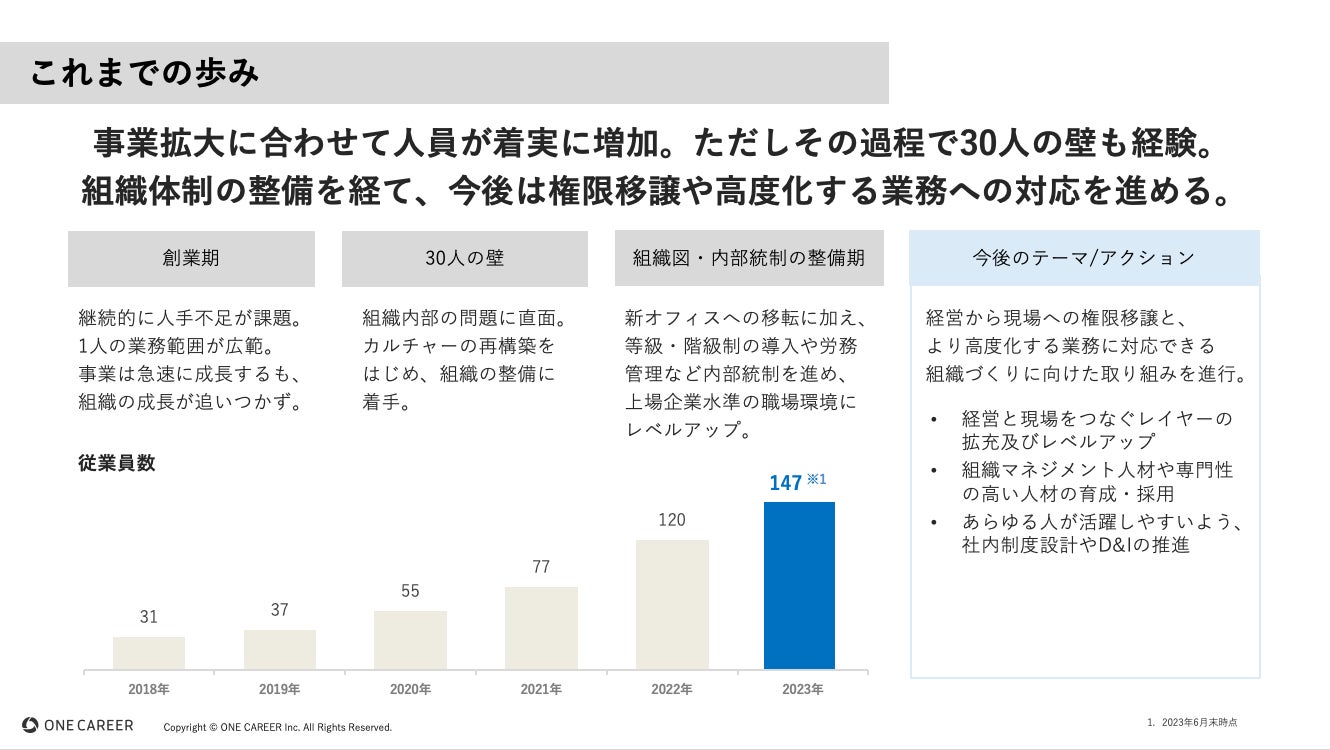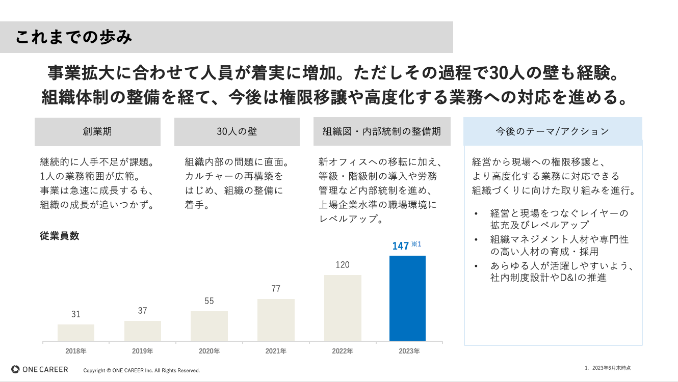 正社員数は2022年に100名を超え、2023年6月時点で147名を突破しました。今後もミッションである「人の数だけ、キャリアをつくる。」の実現に向け、事業拡大と共に組織拡大が着実に行えるよう、採用を強化してまいります。