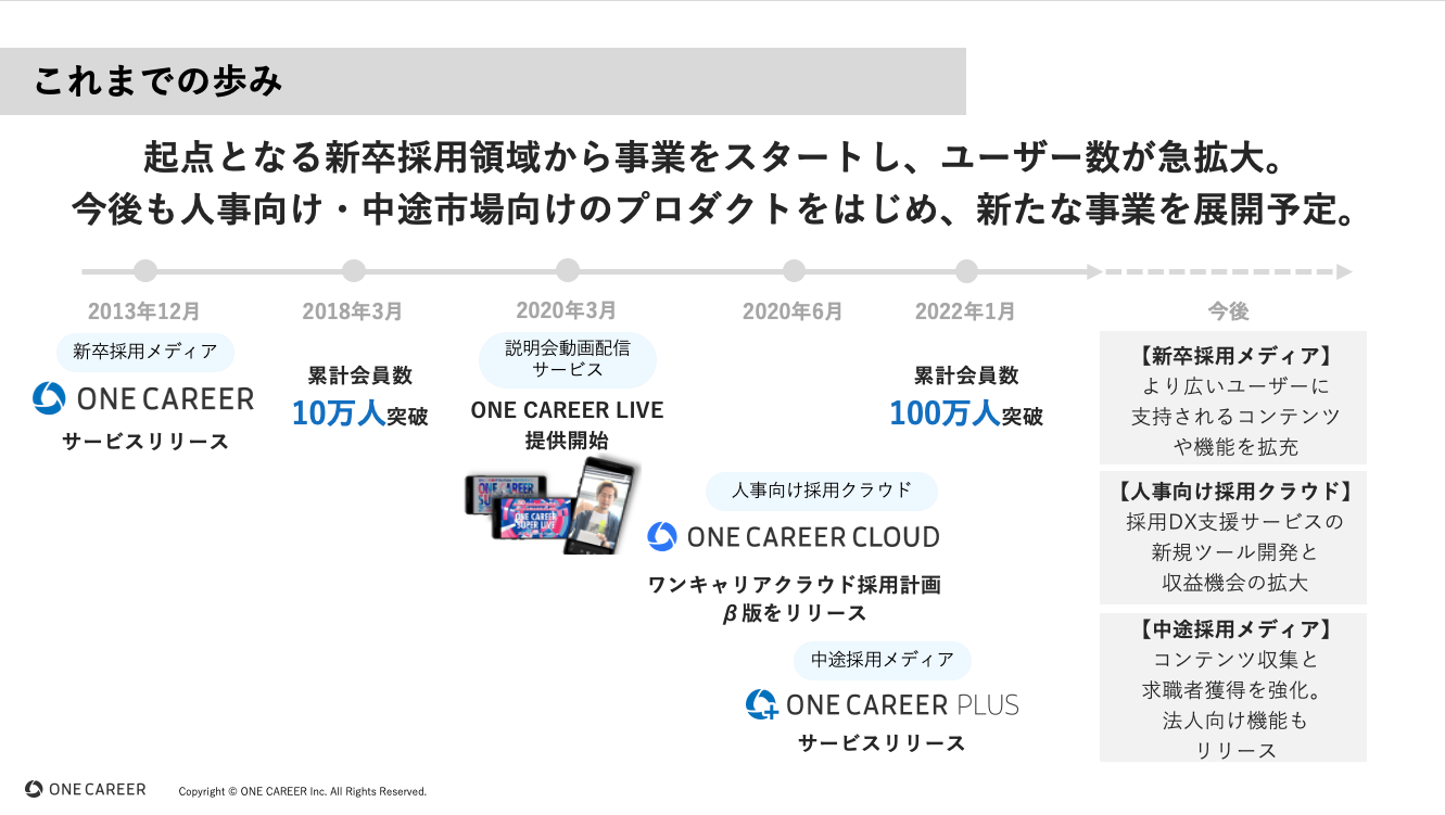 企業人事向けサービスとして、「キャリアデータプラットフォーム」を活用して採用活動を支援するワンキャリアクラウドシリーズを提供しております。新卒採用支援メディア「ONE CAREER」に会社情報や求人広告を掲載することができる求人掲載機能やオンライン説明会をはじめとした高品質なデジタルコンテンツで採用ブランドをデザインする動画サービス機能、採用活動計画を立案する際に必要なマーケティングデータを提供する採用計画機能を有しております。今後、採用計画の立案から求職者の募集、選考活動の管理に至るまで、企業の採用活動を通貫して支えるデジタルツールとして提供することで、企業の採用活動のDXを推進することを目指していきます。