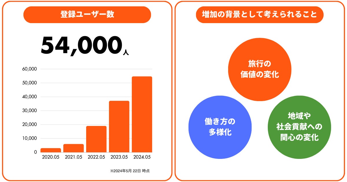 現在の登録ユーザー数は54,000人。従来の「旅行=娯楽」の概念を超え、「旅先で働くのも面白い」という価値観が広がりつつあります。
