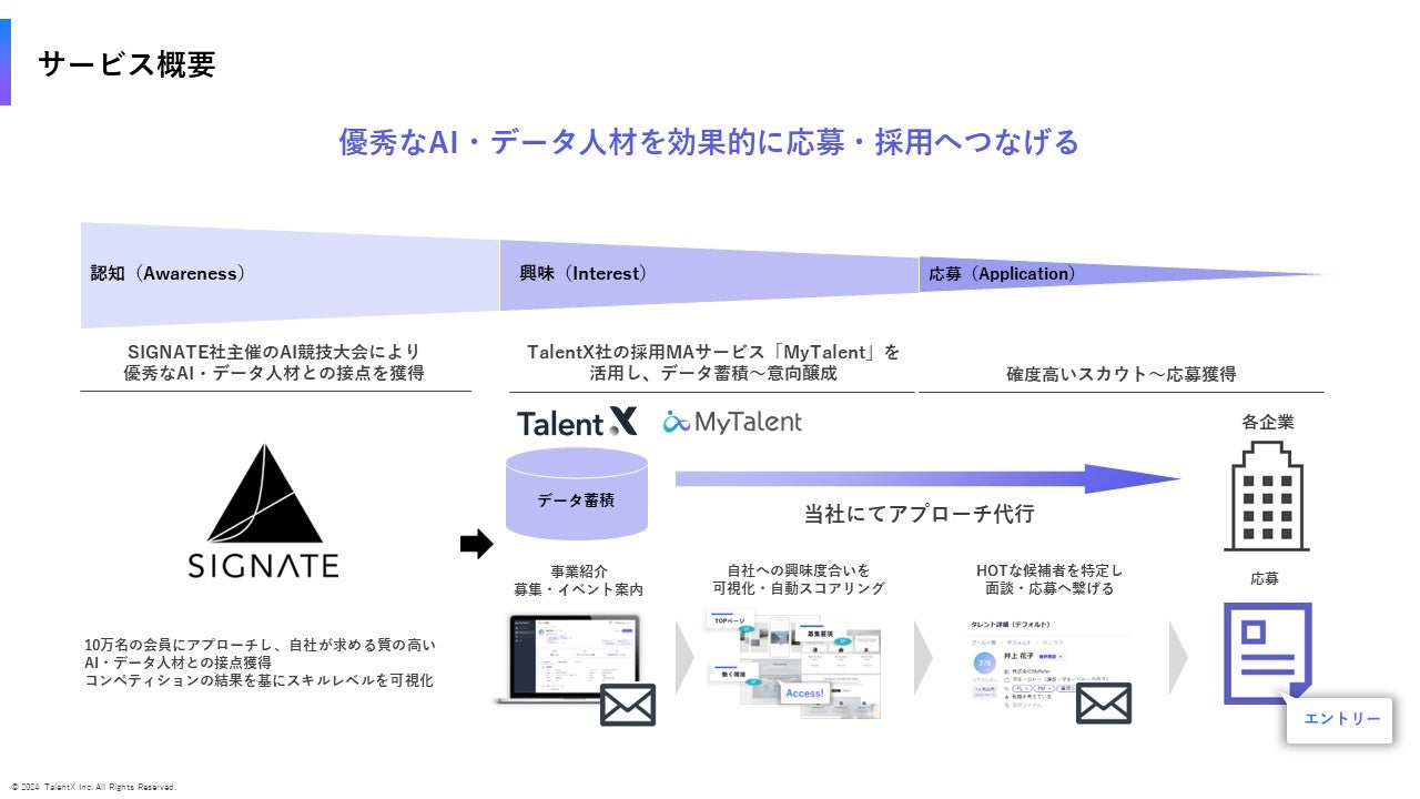 AI・データ人材の獲得に対して課題を抱える企業様向けに、専門人材の採用支援サービスを提供開始します。SIGNATEのAI・データ人材約10万人の会員に対して、開発したAIの性能を競い合う競技大会(AI開発コンペティション)を実施し、各企業が求める質の高い参加者との接点を創出します。また、TalentXの採用MAサービス「MyTalent」を活用し、参加者のデータ蓄積から継続的なアプローチによる意向醸成、応募獲得といった採用マーケティングを支援します。