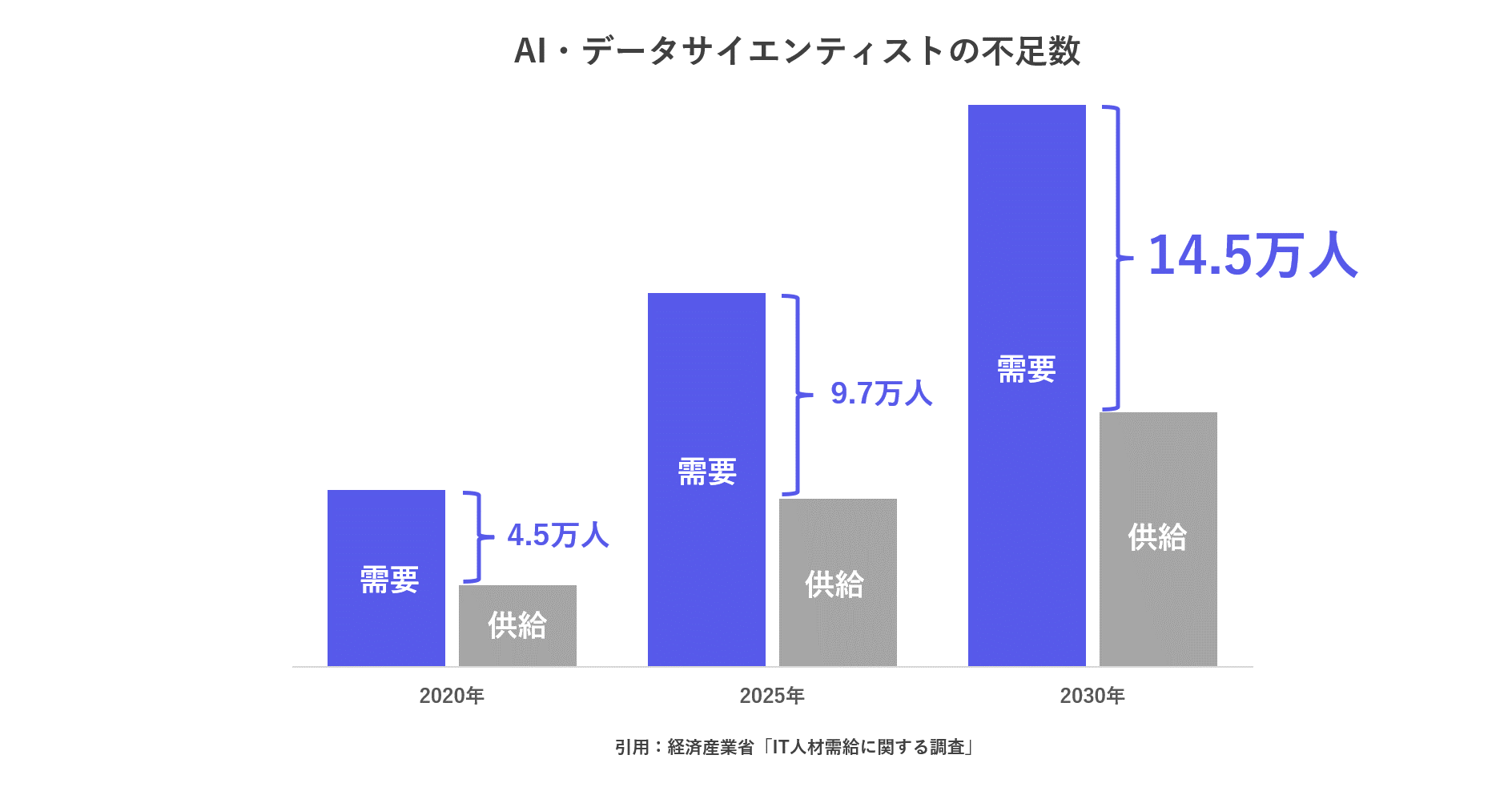 その要因のひとつとして国内のAI・データ人材が不足していることが挙げられます。2020年時点でAI人材は約4.5万人不足し、2025年には約9.7万人、2030年には約14.5万人まで不足数が拡大すると言われています。(※)AI人材の需要に対して供給が追いついていないため、ターゲット候補者と出会う機会を創出しづらく、ターゲット候補者と出会えたとしても激化する獲得競争の中で勝ち抜くのは困難です。この状況下で継続的に優秀なAI・データ人材を獲得していくためには、AI・データ人材の転職潜在層にアプローチすることが求められます。(※経済産業省「IT人材需給に関する調査」)