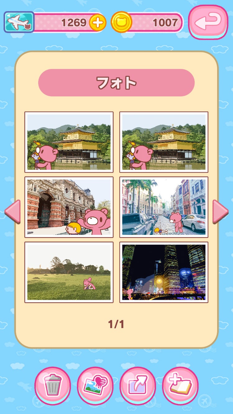 グル~ミ~とピティーくんをいろいろな場所に旅行させて写真とお土産をたくさん集めて楽しもう!