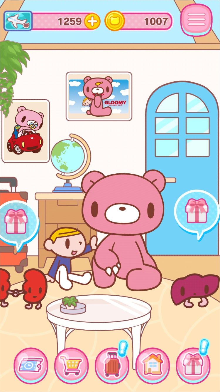 本ゲームはグル~ミ~とピティーくんを世界中に旅行させて、世界各国の記念写真やお土産を集めたり、お部屋を模様替えして楽しむシンプルな放置ゲームとなっております。