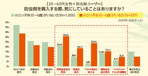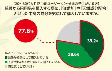今回、当社が独自に調査したところ、小さい子供がいる防虫剤ユーザーは、防虫剤購入時に体にやさしい成分や仕様を気にして選ぶ傾向があり、さらにその約8割が普段の日用品購入時にも成分を気にしていることが分かりました(下図参照)。そこで今回、“家族みんなの衣類をやさしくしっかり守る”という商品コンセプトが伝わるパッケージデザインにリニューアルいたします。「無添加防虫剤」「100%天然由来成分」といった商品特長に加えて、皮膚パッチテスト、アレルギーテストを実施済みであることを正面に表記し、安心・安全な商品イメージを訴求しました。