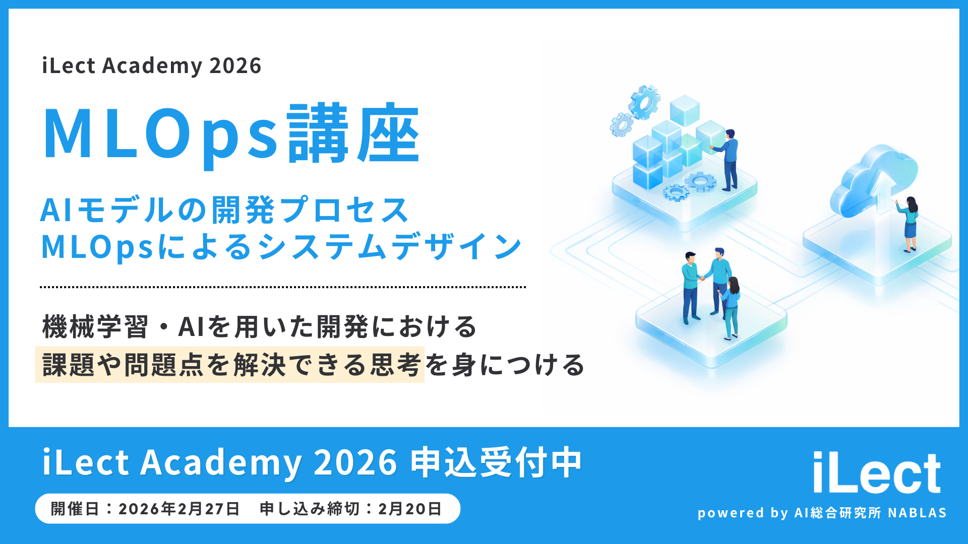 AI総合研究所として活動するNABLAS株式会社(本社 : 東京都文京区本郷、 代表取締役 所長 : 中山 浩太郎、 以下「当社」)が提供する実課題の解決を目的としたAI人材育成サービス iLect は、この度、複数社合同講座 iLect Academy 2026 にて「MLOps講座」(以下:当講座)の開催を決定し、申込受付を開始しました。