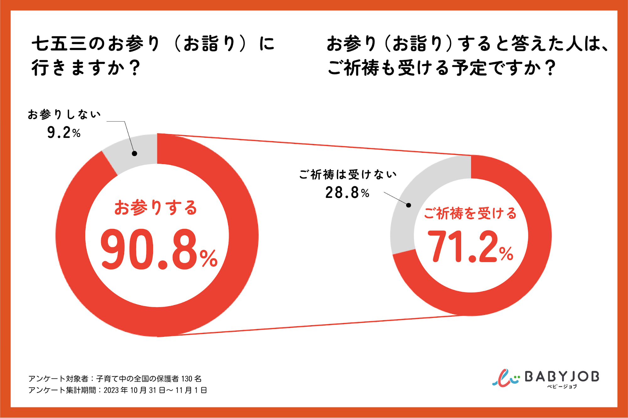 七五三では、お宮参りと同じ神社にお参りに行くのが一般的です。BABY JOBが全国の保護者130名にアンケート調査を行ったところ、90.8%の保護者が「神社に参拝する」と回答し、そのうち71.2%が「ご祈祷も受ける」と回答しており、多くの保護者が神社へのお参りとご祈祷を受けることが分かりました。