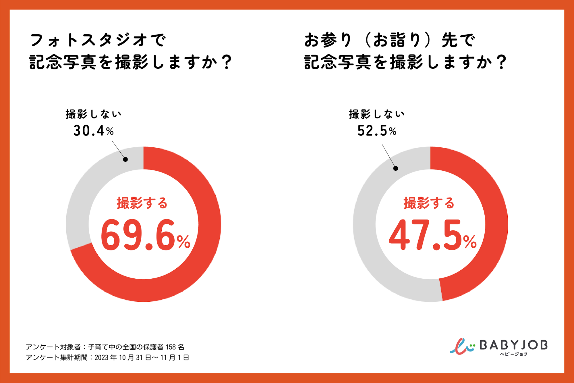 七五三の記念写真は、神社だけではなく、フォトスタジオでの撮影も種類が豊富で人気です。フォトスタジオで撮影すると回答した保護者は69.6%と、7割近くいるのに対し、神社で撮影すると回答した保護者は47.5%と半数以下に留まりました。