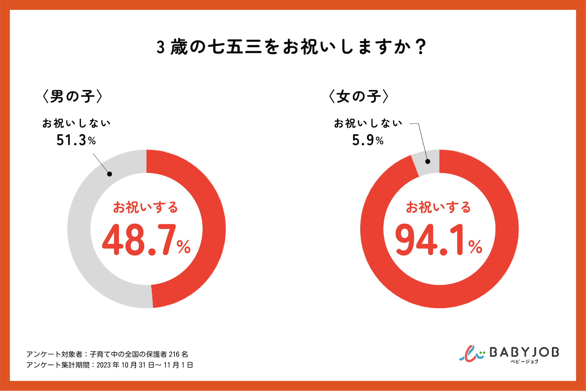 BABY JOBが、保育施設探しをサポートする「えんさがそっ♪」のSNSで全国の保護者216名にアンケート調査を行った結果、3歳で七五三のお祝いをするのは、女の子が94.1%であるのに対し、男の子は48.7%と、2倍近い差があることが分かりました。