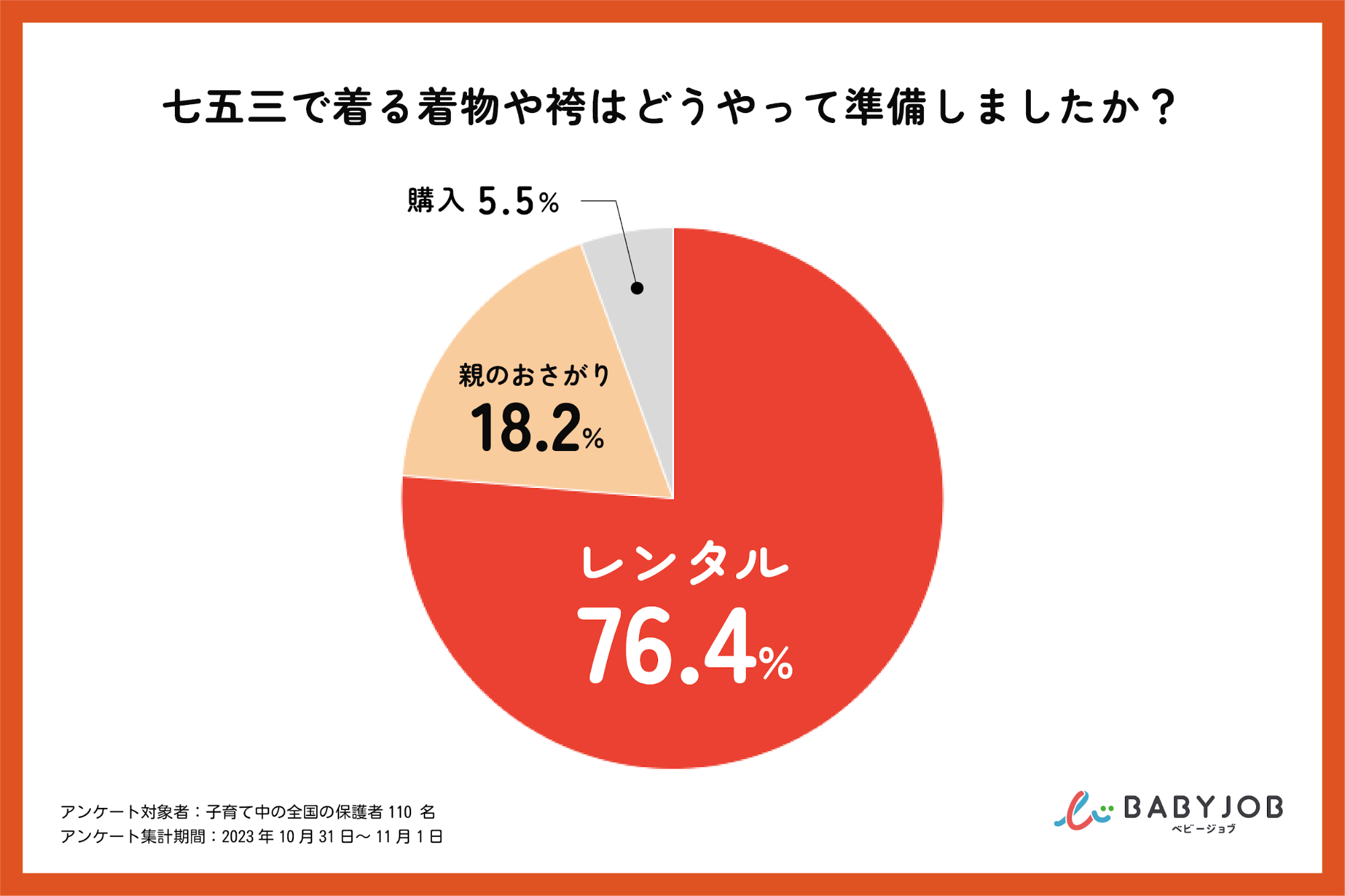 BABY JOBが全国の保護者67名にアンケート調査を行ったところ、七五三のお祝いをするのは、「11月の予約が取れた日」が80.6%で最多となりました。また、110名の保護者を対象に行ったアンケート調査では、当日着る着物や袴は「レンタル」すると回答した保護者が76.4%で最多となりました。