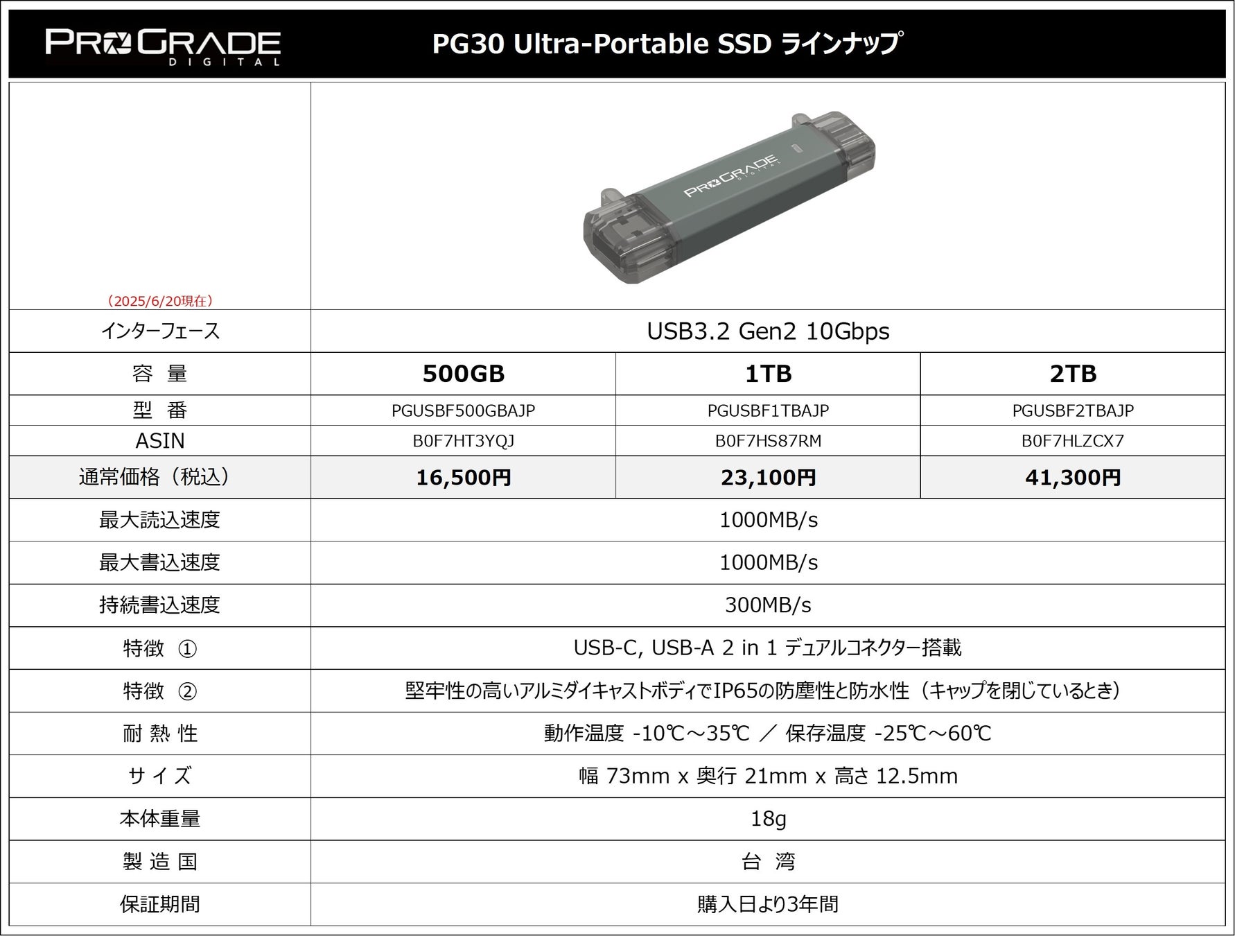 ProGrade Digital Incは、USB-C/Aデュアルコネクター搭載アルミダイキャストボディのPG30 Ultra-Portable SSDを3種類の容量ラインナップ(500GB/1TB/2TB)で販売を開始しました。税込価格は 500GB 16,500円 1TB 23,100円、2TB 41,300円円です。