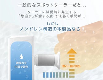 一般的なスポットクーラーは稼働時に除湿水が発生し、その除湿水がたまるたびに水を抜く手間がありました。しかし今回登場した3機種にも採用されているノンドレン構造の製品は、発生した除湿水を本体内部で蒸発させ温風と一緒に外へ排出するため、排水の手間がなくなり、より楽にご使用いただくことができます。