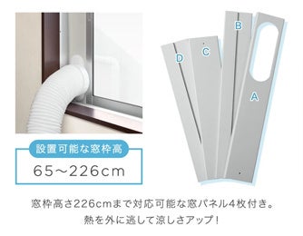 スポットクーラーはエアコン同様に取り込んだお部屋の空気を冷風と温風に分け排出するため、温風を排気ダクトで室外に出す必要があります。タンスのゲンのスポットクーラーには65~226cmの窓枠の高さに対応可能な窓パネルを4枚付属しており、効率的に温風を室外に排出することが可能です。一般的な家屋の掃き出し窓の高さが180cm前後なので、多くのご家庭でパネルを設置することができます。