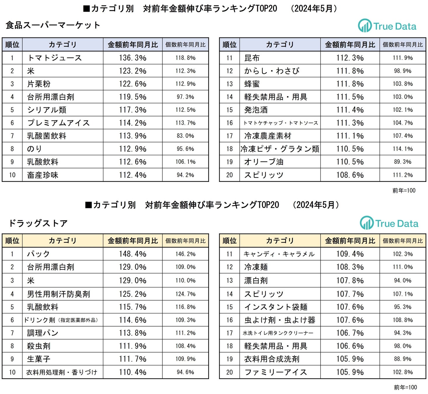 ~ドラッグストア、食品スーパーマーケット 対前年伸び率TOP20カテゴリを発表【2024年5月】~