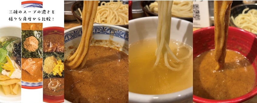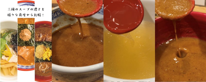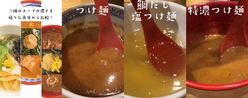 ノーマルの豚骨魚介つけ麺、鯛だし塩つけ麺、そして特濃つけ麺の3種のスープを用意し、“スープまぜ”の動画を撮影しました。お椀に注がれた各スープをレンゲでかき混ぜる動きから、早くも粘度の違いが窺えます。