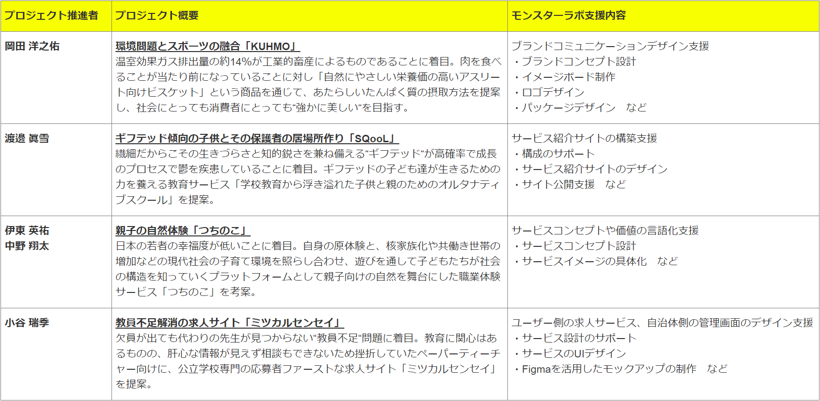 モンスターラボは全10組のうち以下4組の学生に対する支援を行っています。支援期間終了(〜2024年3月末)までの間、引き続きサービスサイトの制作や新規事業プランのブラッシュアップ等の支援を行っていきます。