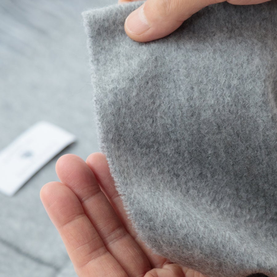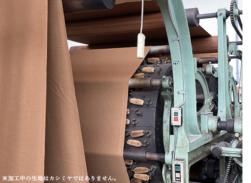 カシミヤ生地をくぐらせることで、“波打つ”ような独特の起毛を生み出すだけでなく、カシミヤが本来持つふわふわの風合いを最大限引き出しています。