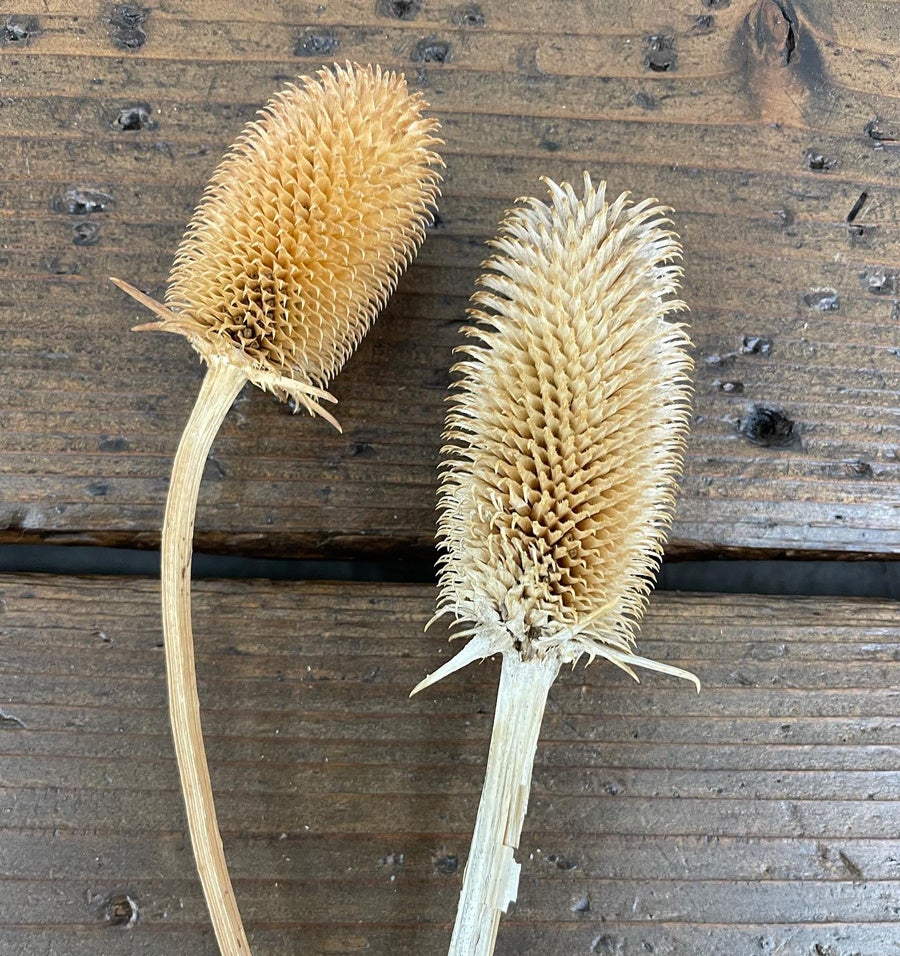 微細な“トゲ”が洋服にくっ付いてなかなか取れませんが、「チーゼル」はこのひっつき虫を大きくしたような植物のこと。