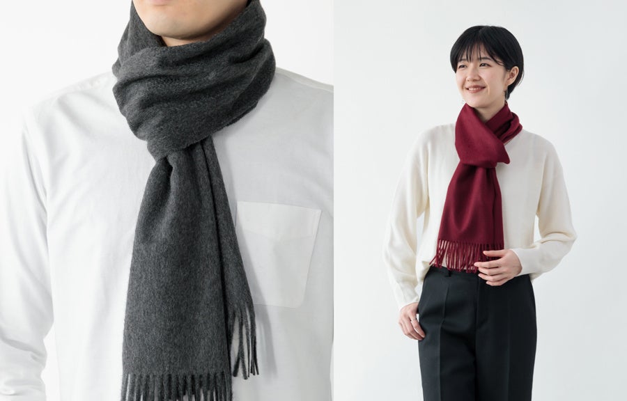 どちらも光沢材を一切使用せず、カシミヤが本来持つ光沢を引き出したエレガントなマフラーが冬の首元に品を与えてくれます。
