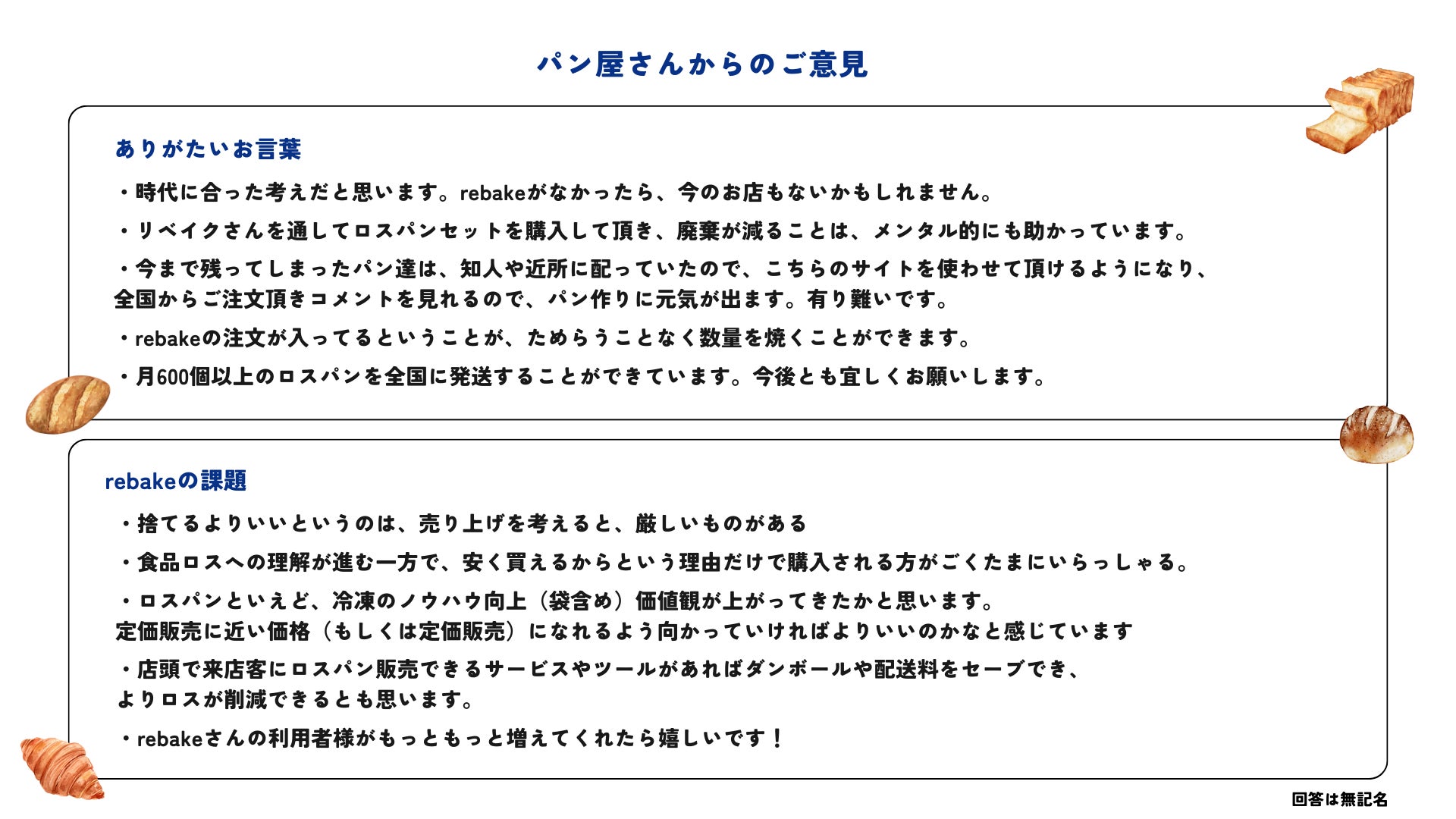・rebakeさんが始まった当初から利用しています。お陰様でロスパンがほぼゼロになりました。店舗数も驚くほど増えてフードロスに対する意識も高まっていると感じます。