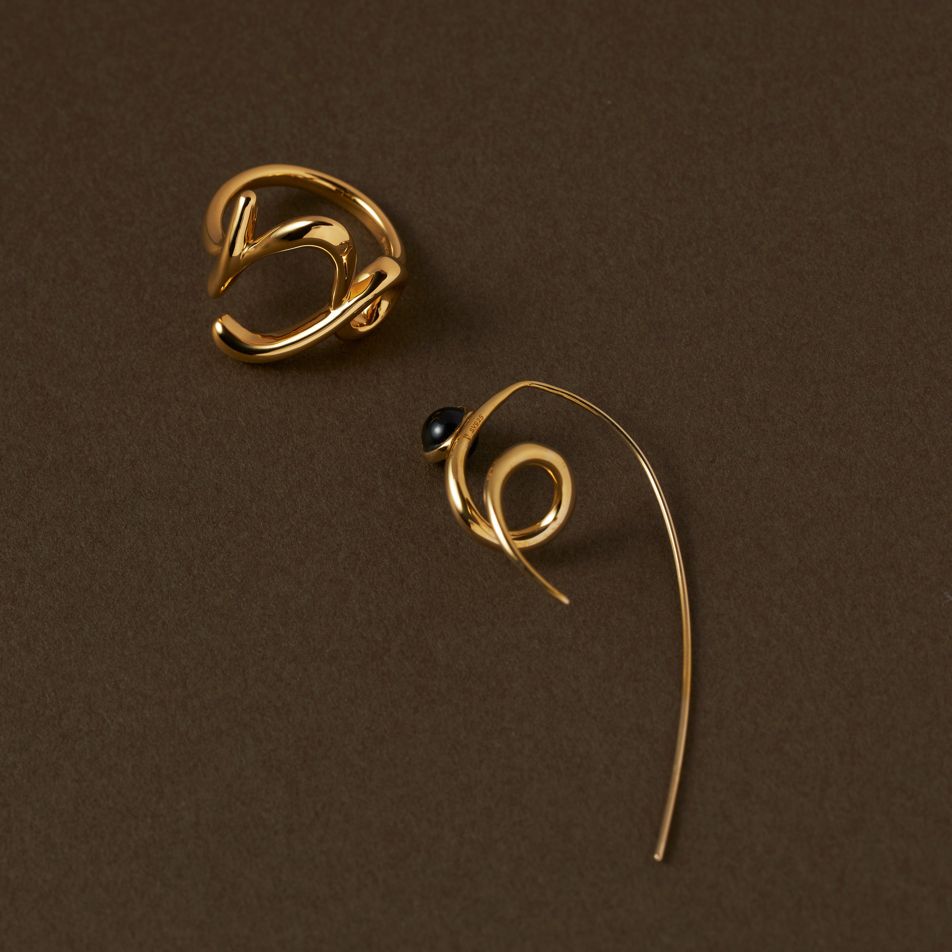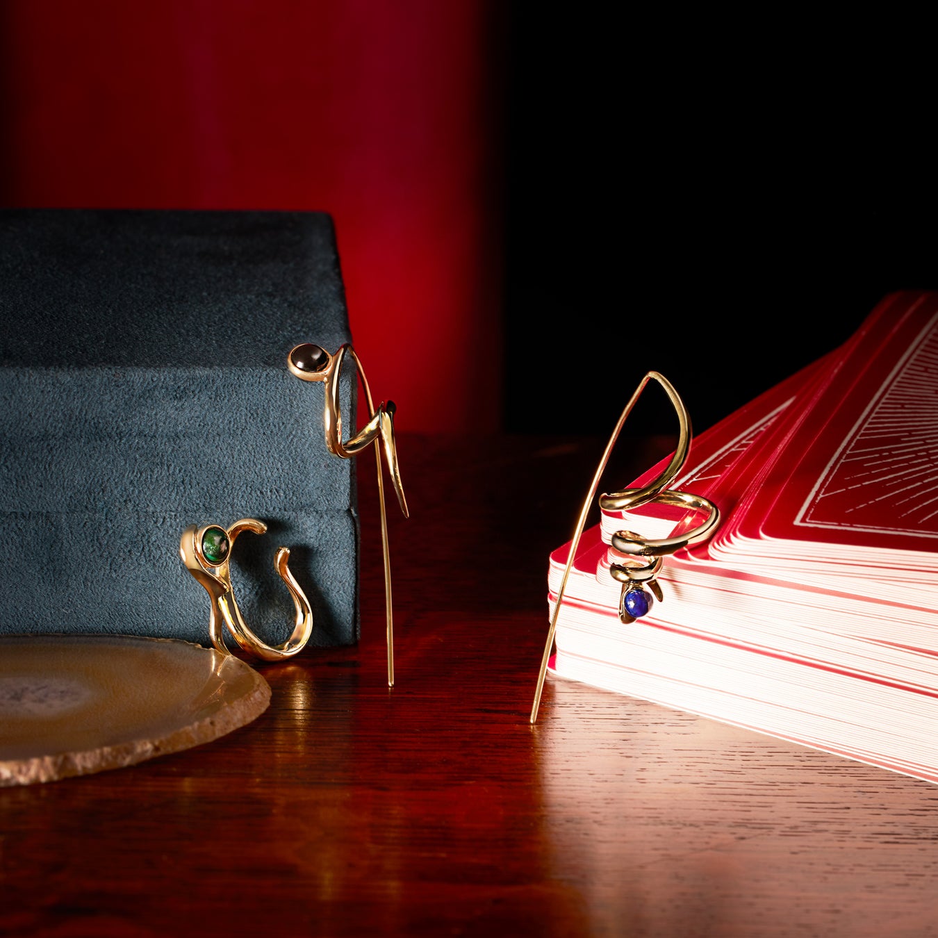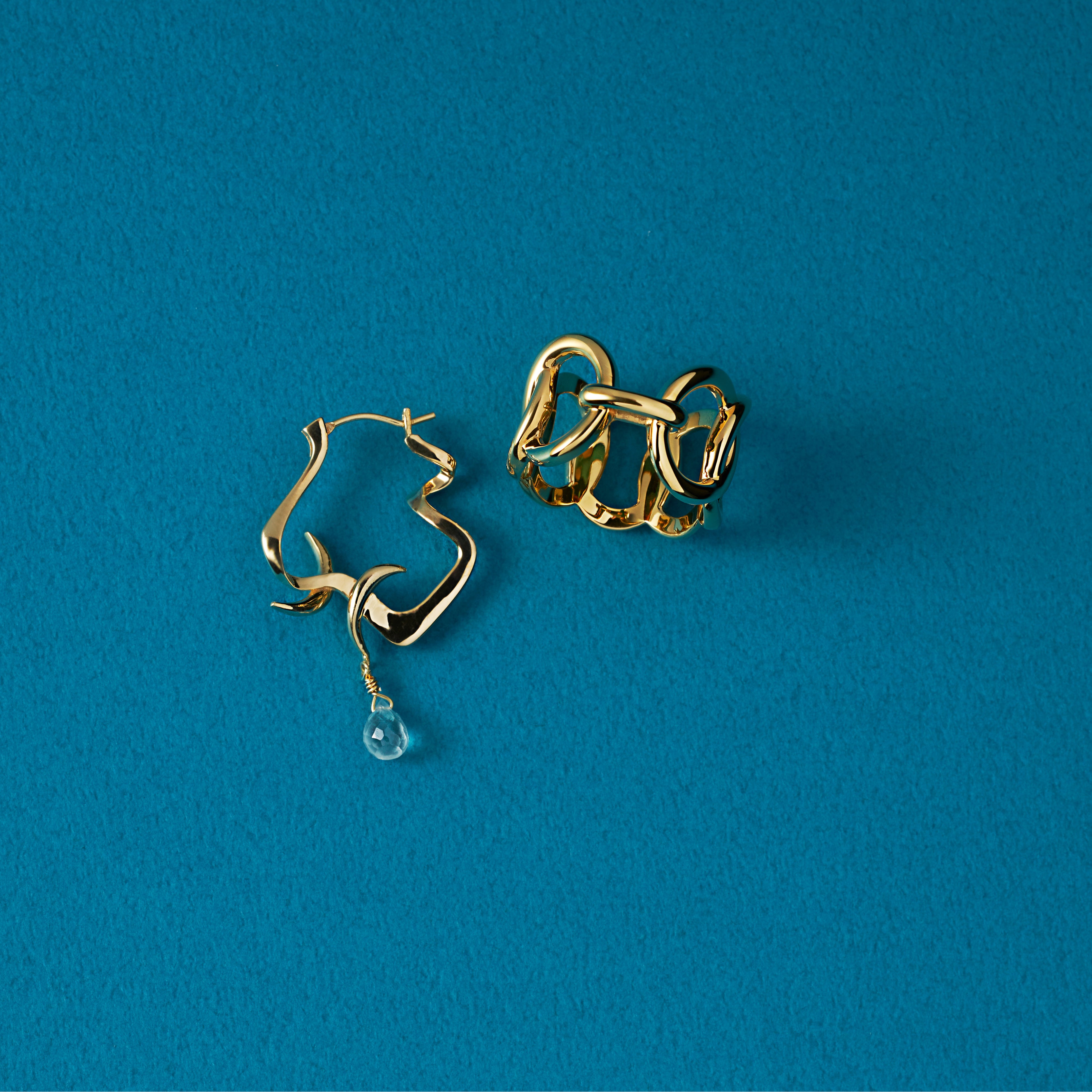 立体的な地金のラインにはそれぞれの星座の星座石が輝き、耳もとをドラマティックに彩ります。
