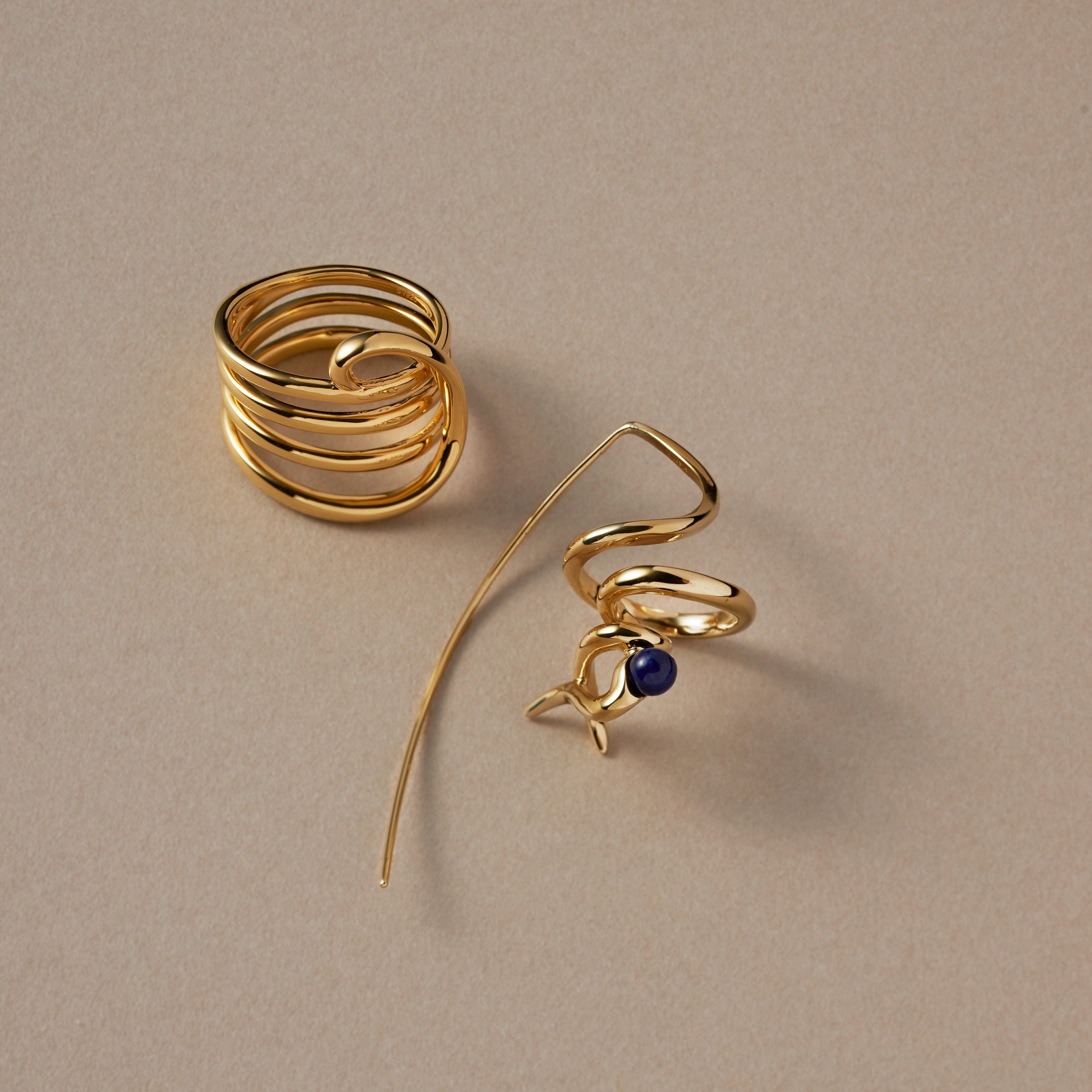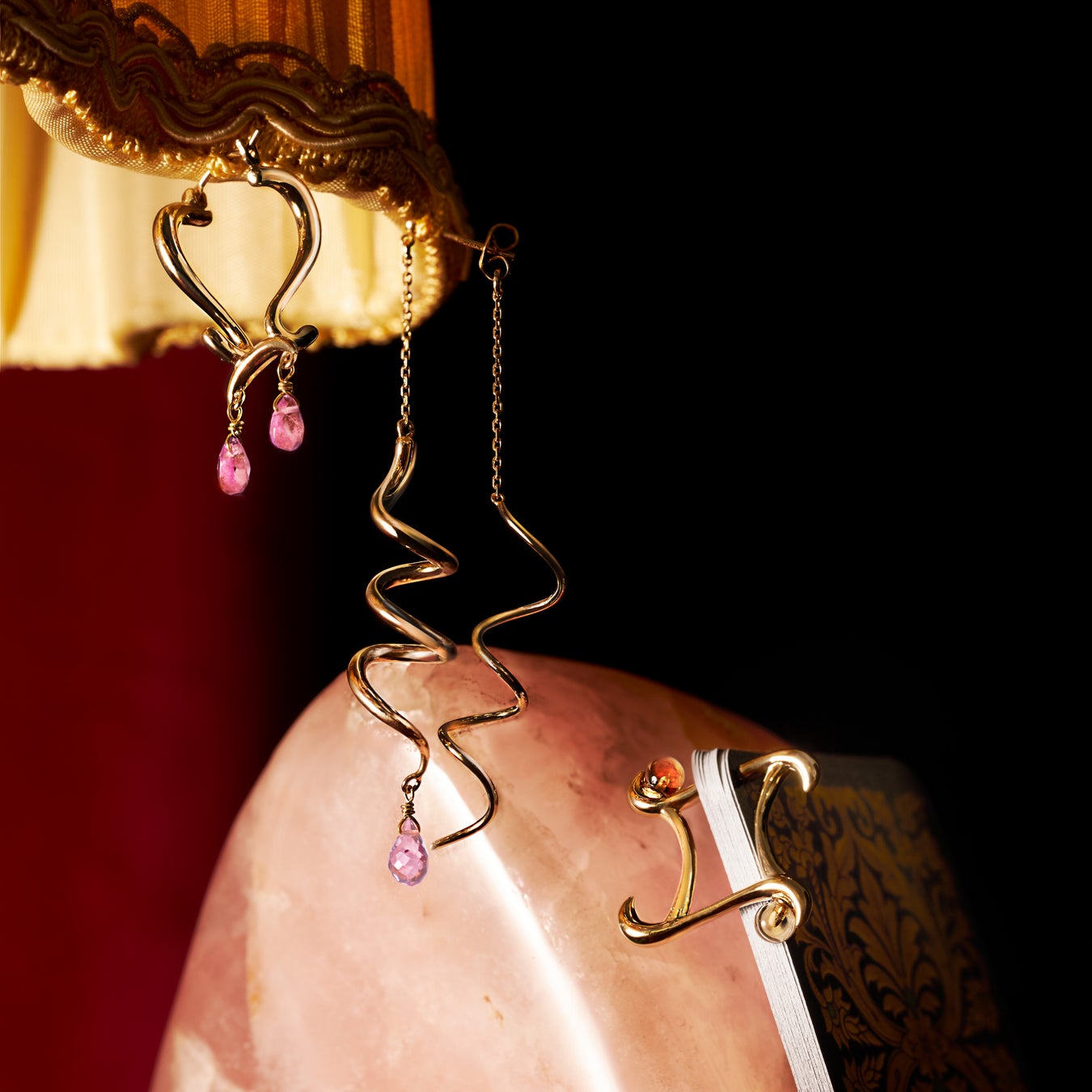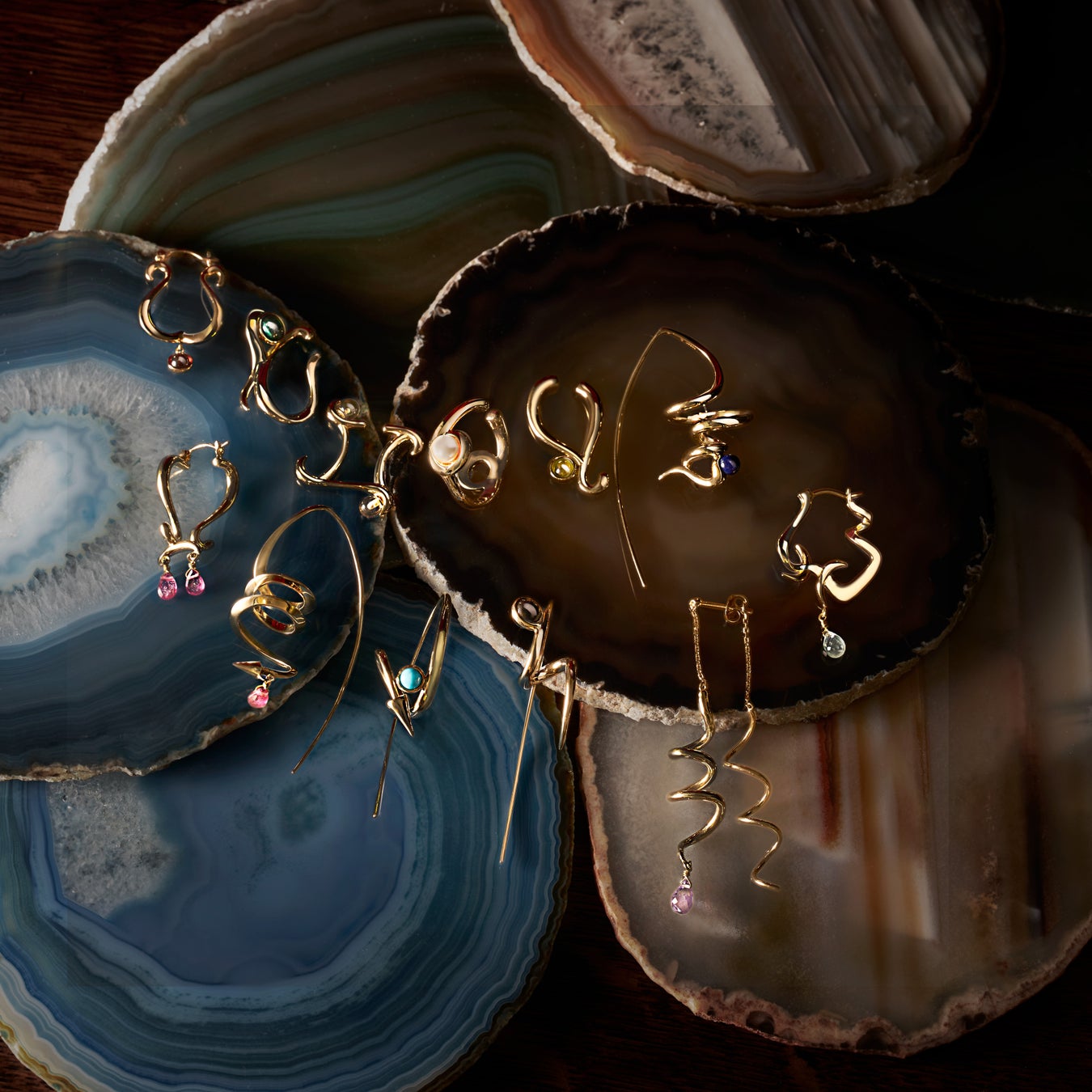 立体的な地金のラインにはそれぞれの星座の星座石が輝き、耳もとをドラマティックに彩ります。