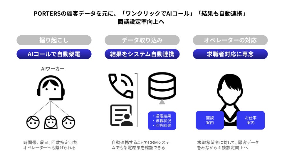 PORTERSのデータを元に、これまで人の手が行き届かなかった過去の登録者リストに対しても、AIが架電によるアプローチを開始します。AIによる一次対応で求職意欲のある方を質問回答結果を元に、オペレーターやキャリアアドバイザーがスムーズに引き継ぐことで、AIと人が協働し、限られたリソースで最大の成果を上げられる施策を実現します。