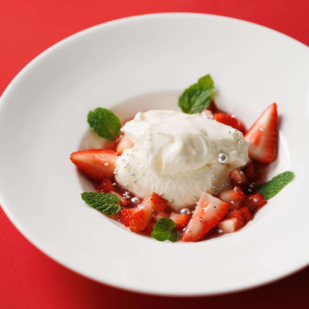 Xmasリースをイメージして、フレッシュ苺やハチミツ、ストロベリーソース、ミント、アラザンで生チーズケーキをデコレーションしたスイーツプレートです。