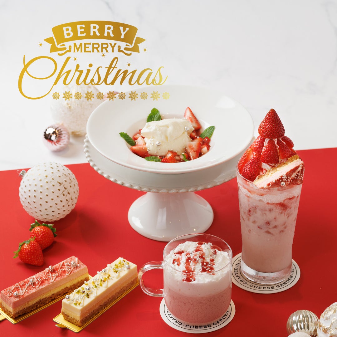 今回の『BERRY MERRY Christmas』では、クリスマスカラーの“赤×白”を“苺×チーズ”で表現した、チーズガーデンならではの大人可愛いクリスマスシーズン限定のカフェメニューです。苺とさまざまなチーズが織りなすチーズスイーツドリンクやスイーツプレート、チーズケーキの全5品を販売いたします。