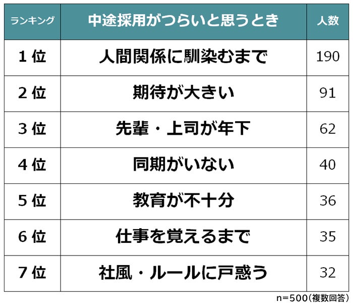 転職して中途採用で入社した経験のある500人を対象にアンケートを行ったところ、「中途採用はつらいと思うとき」第1位は「人間関係に馴染むまで」でした。