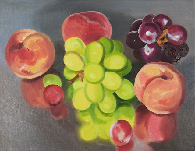 かけがえのない日々の記録でもある作品群は、油絵の古典的な技法を用いて制作され、対象物を的確にとらえるすばやい筆致が特徴。近年は「光」の効果を追求し、モチーフとなる食材そのものが内部から発光しているかのような堂々たる気配をまとう作品を手がけている。