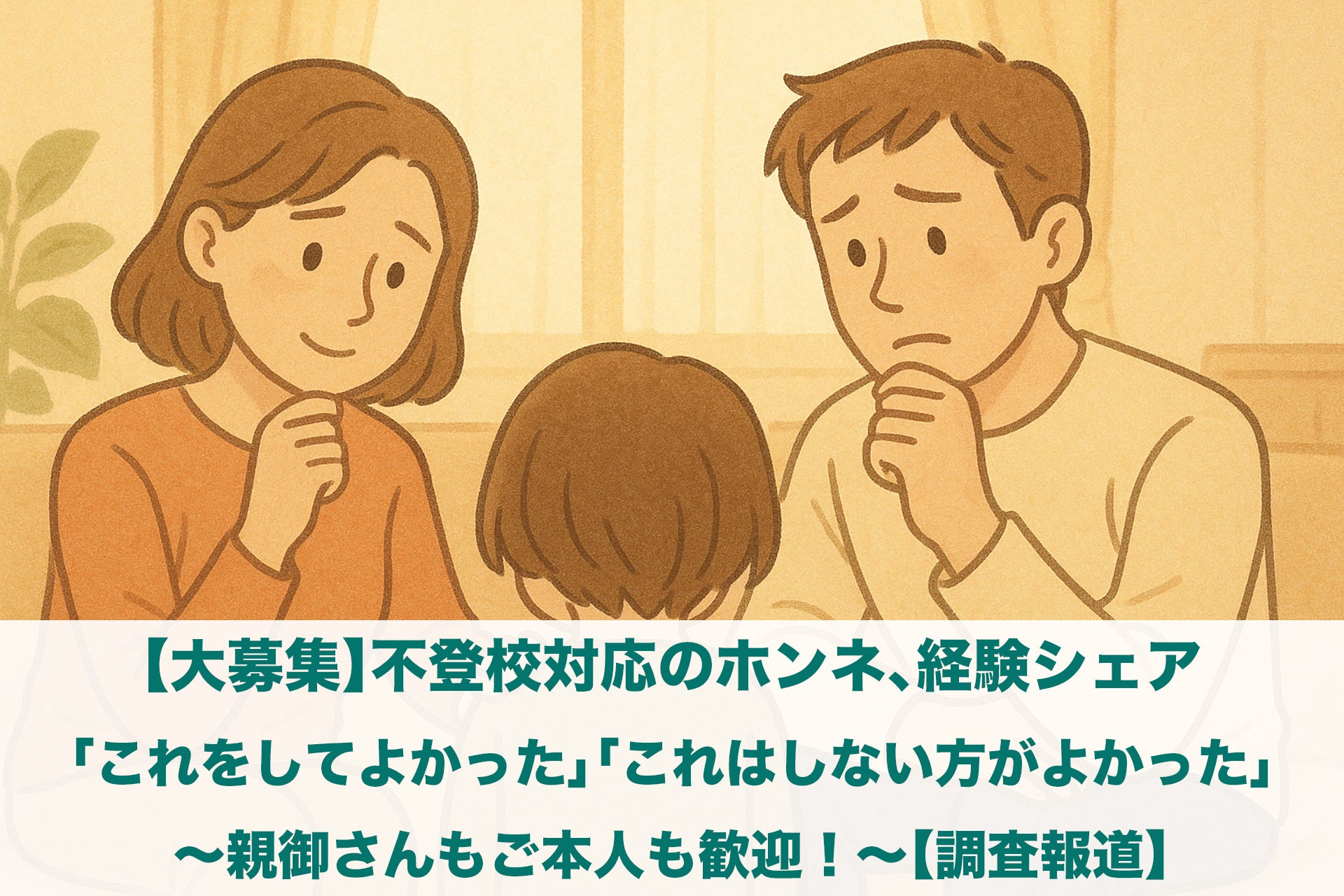 【大募集】不登校対応のホンネ、経験シェア「これ、やってよかった」「これはやらない方がよかった」〜親御さんもご本人も歓迎!〜【調査報道】