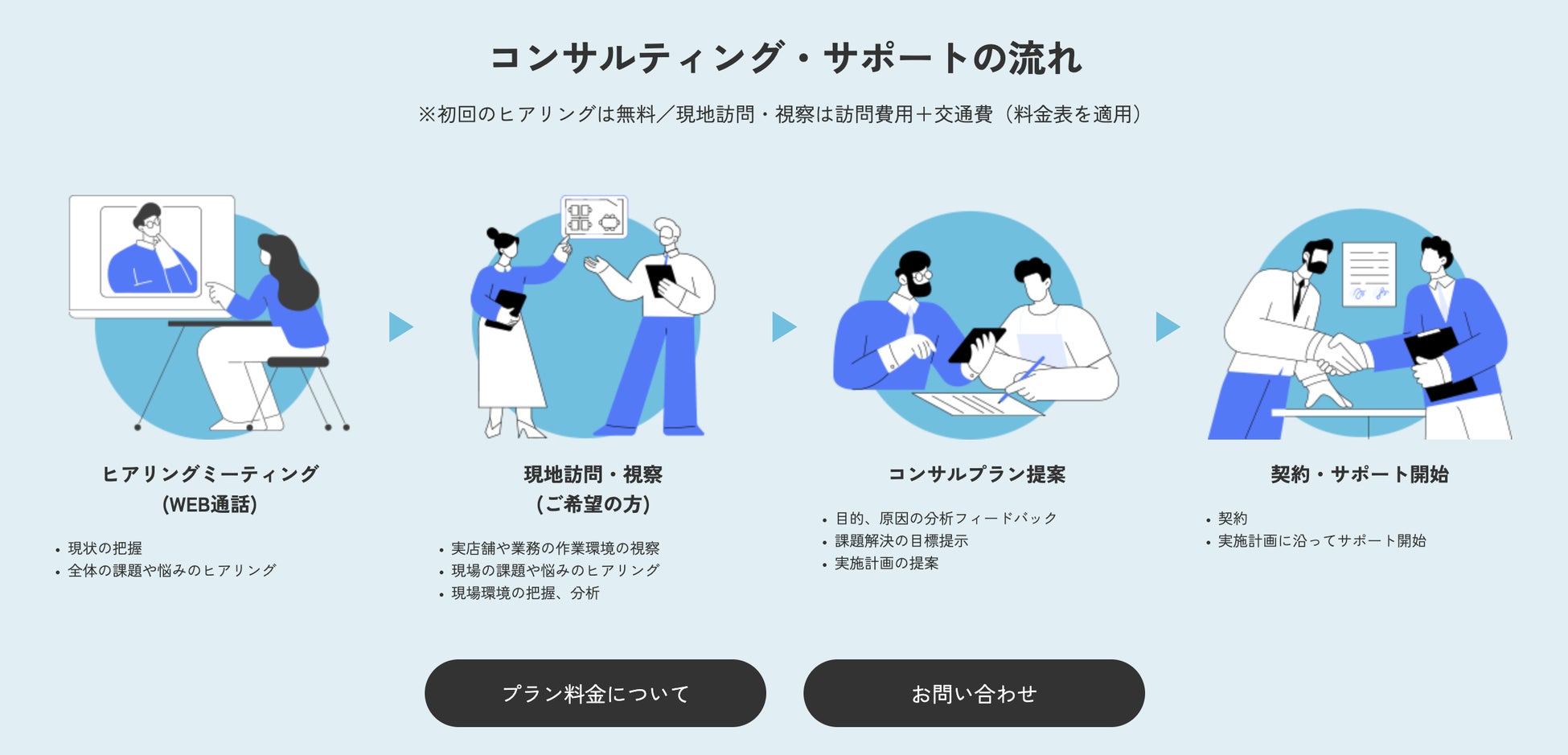まずは初回MTGを行い、店舗運営の問題点や改善したい内容をしっかりとヒアリングさせて頂きます。