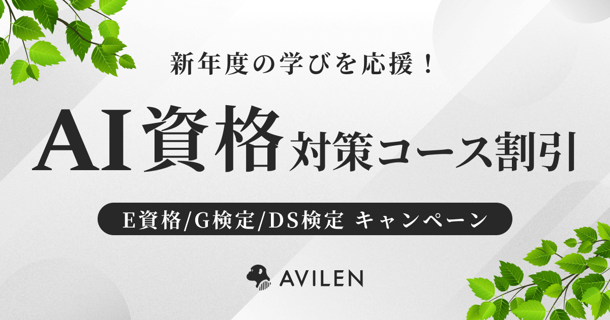 新年度を迎えて新たにAI・データサイエンスの知識を身につけたい方に向け、AVILENがご提供しているAI資格対策コースの割引キャンペーンを5/8まで延長します。