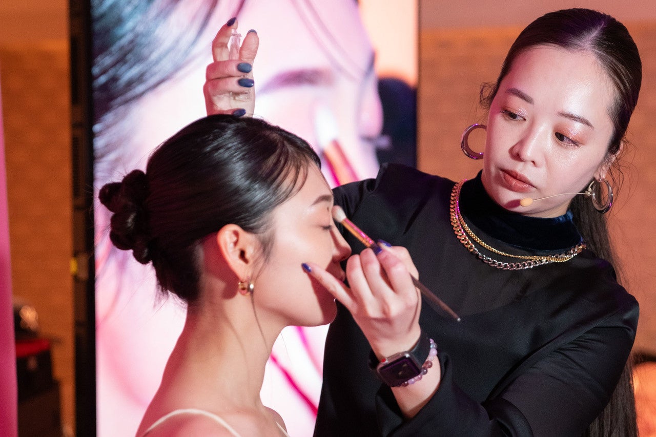 『シャンパンで乾杯!輝き弾けるコスメ』をイメージした華やかな会場には、フォトブースやタッチアップコーナーがあり、Zutti Mattiaさん登壇のトークショーや、メイクデモンストレーションを行いました。
