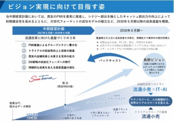 ⚫︎「競争戦略本部」を新たに設置し、業態戦略、商品戦略、販売・オペレーション戦略の3軸を強化し、トライアルの収益性向上と成長の推進、西友とのPMI推進を加速させます。