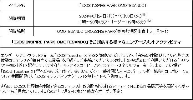 フィリップ モリス ジャパン合同会社(本社:東京都千代田区、社長:シェリー・ゴー、以下「PMJ」)は、2024年6月24日(月)から7月30日(火)の間、「IQOS INSPIRE PARK OMOTESANDO」※(場所:OMOTESANDO CROSSING PARK:東京都港区南青山5丁目1-1)を開催いたします。