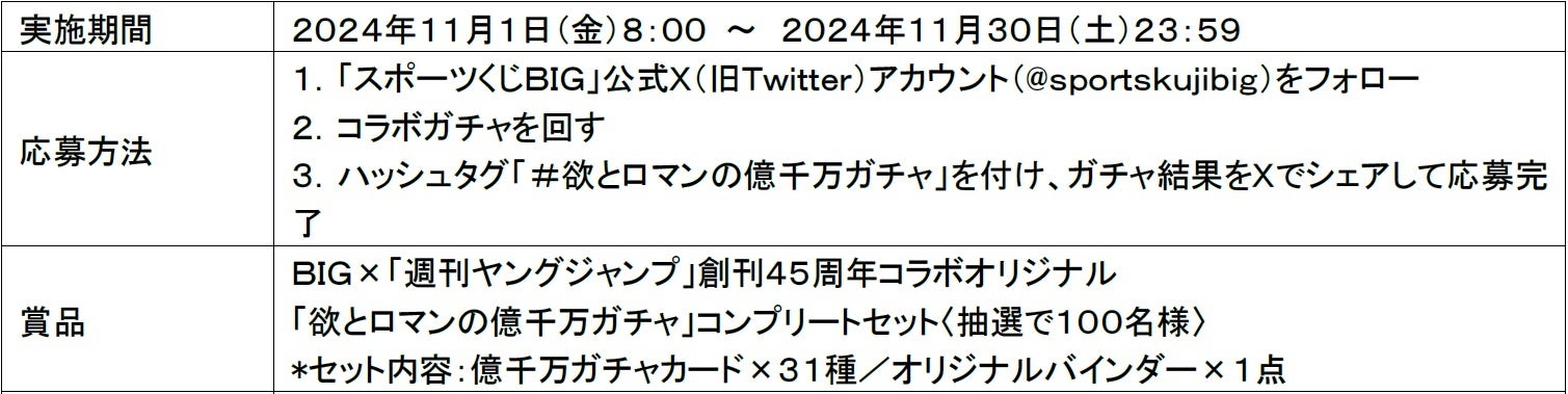 WEB上で展開する「欲とロマンの億千万ガチャ」では、キャンペーン期間中にガチャを回して結果を指定ハッシュタグと共にX(旧Twitter)でシェアした方の中から、抽選で100名様にBIG×「週刊ヤングジャンプ」創刊45周年コラボオリジナル「欲とロマンの億千万ガチャ」カード31種のコンプリートセットをプレゼントします。