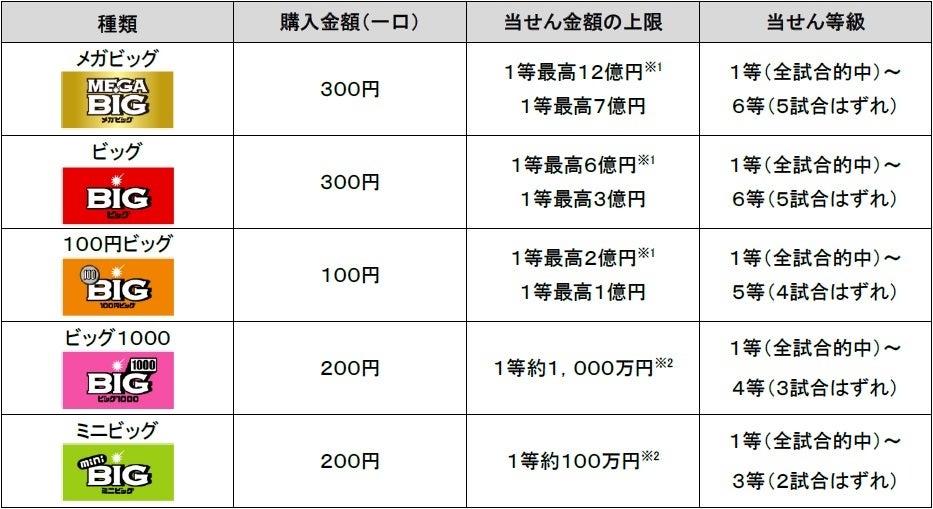 最高当せん金額や購入金額によって異なる種類のBIGが5種あります。