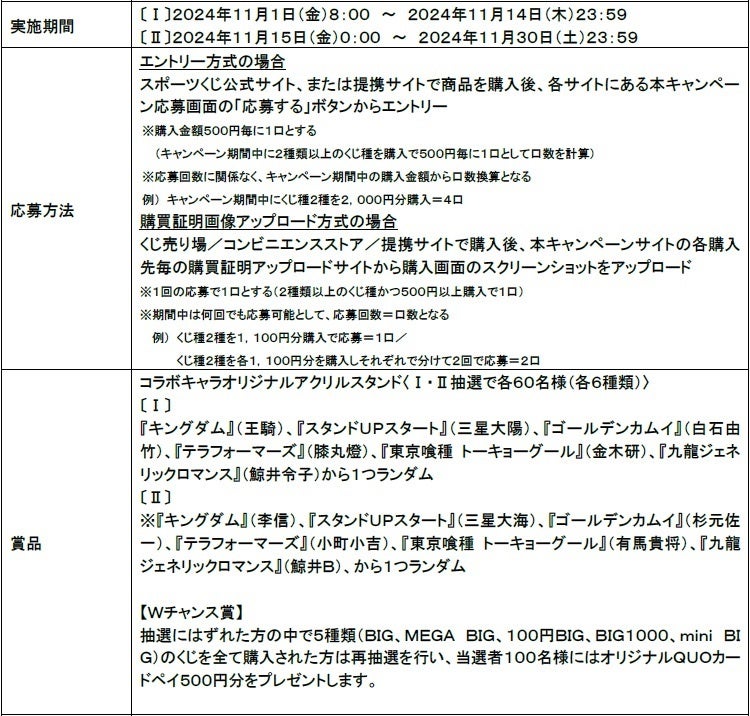 独立行政法人日本スポーツ振興センター(JSC)は、2024年11月1日(金)より、創刊45周年を迎えた「週刊ヤングジャンプ」(集英社)とのコラボキャンペーンを実施します。 スポーツくじBIGには「BIG」、「MEGA BIG」、「100円BIG」、「BIG1000」、「mini BIG」の5種類のラインナップがあります。本キャンペーンは個性豊かな「週刊ヤングジャンプ」のイラストとともに、おすすめ商品の組み合わせや買い方をガチャでランダムに紹介することで、スポーツくじBIGの様々な楽しみ方を発信してまいります。