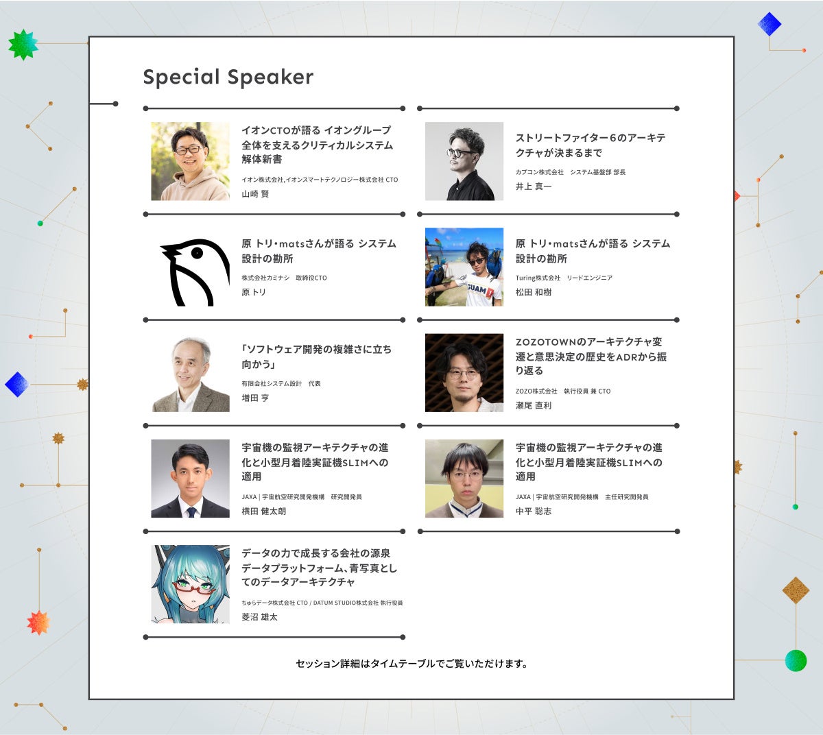 カプコン株式会社、JAXA、ZOZO株式会社、イオン株式会社など、9社の特別登壇含め全32セッション発表予定です。