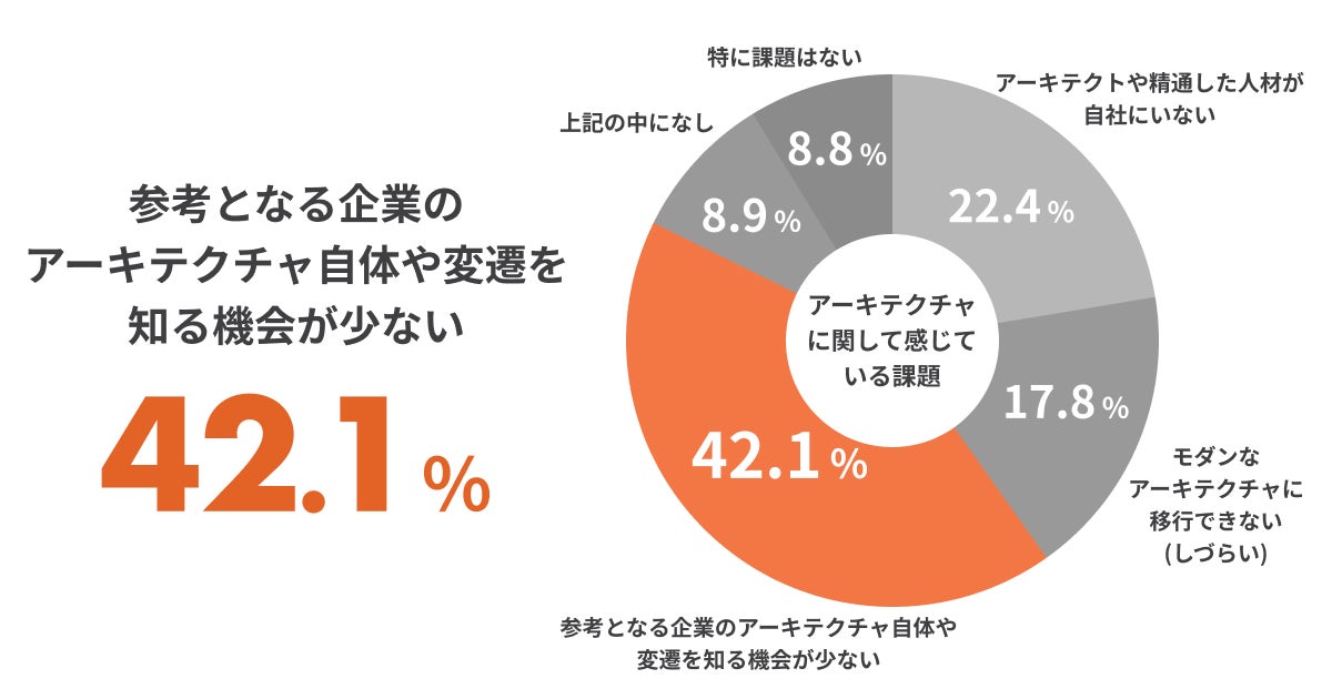 11月1日(金)時点での本カンファレンスへの申込者数は1,200人を突破し、そのうち60%以上がテックリード・マネジメント層以上の方です。また、申込者へのアンケートからアーキテクチャに関する課題として「参考となる企業のアーキテクチャ自体や変遷を知る機会が少ない」が42.1%と最多に。次いで課題として多かったのは「アーキテクトや精通した人材が自社にいない」が22.4%で、人材不足の課題も影響していることがわかります。これらの結果から、日々の業務に加えて自身の環境に参考となるアーキテクチャの事例を集めることがさらに難しくなっていると言えます。