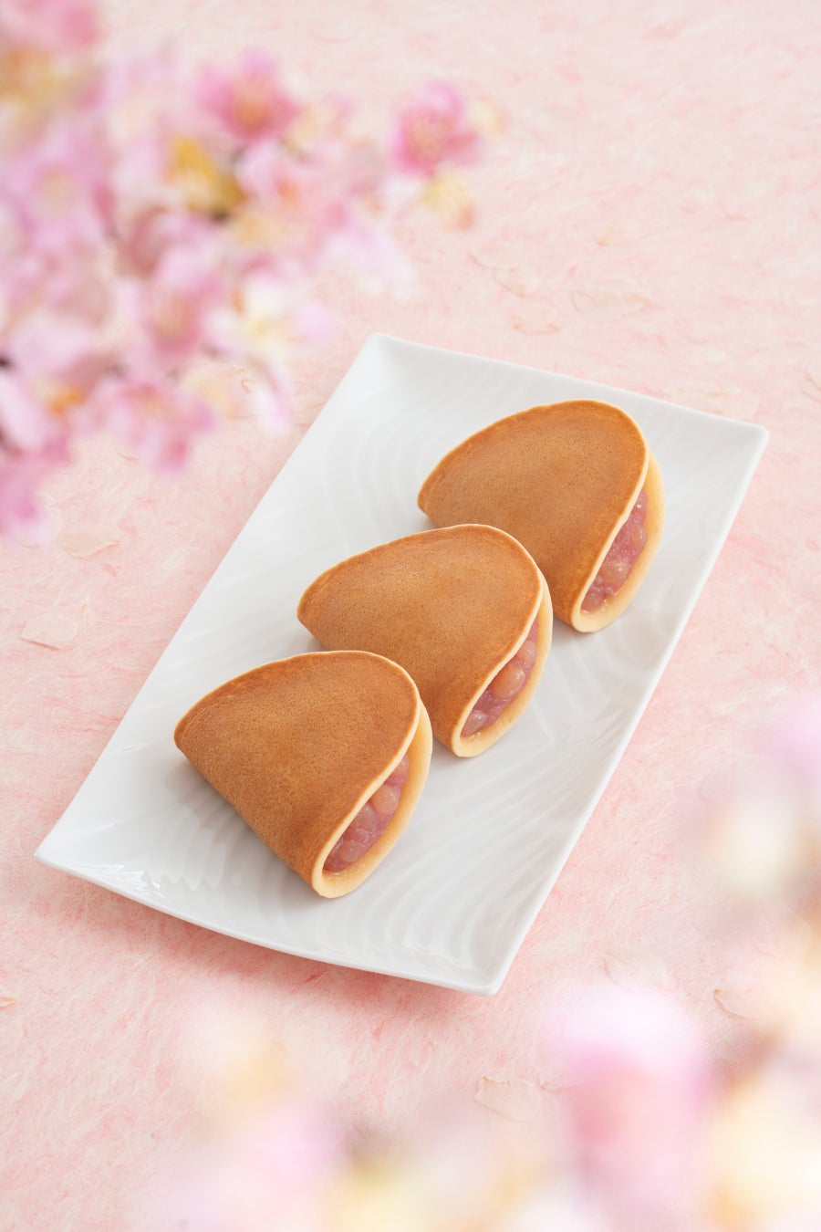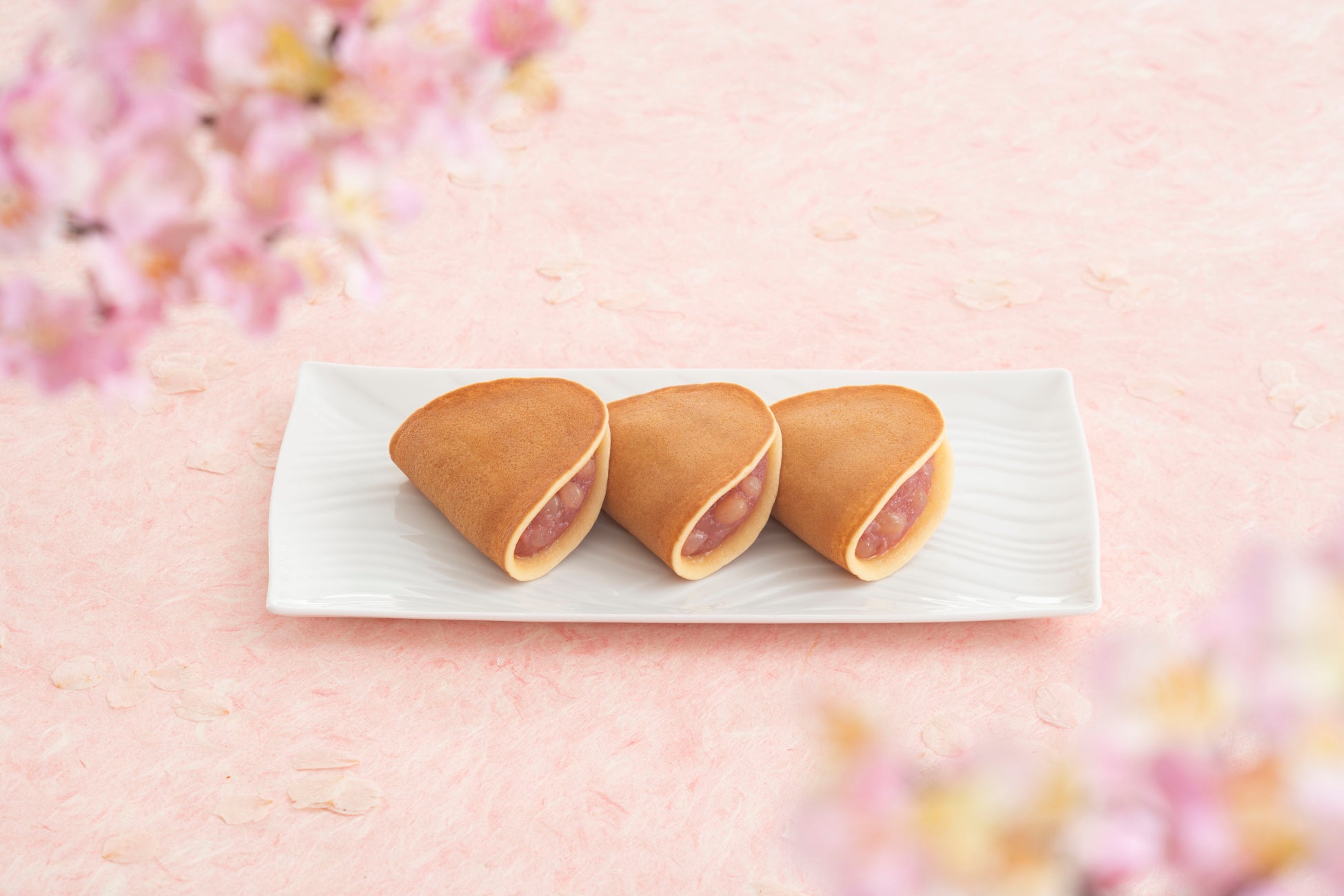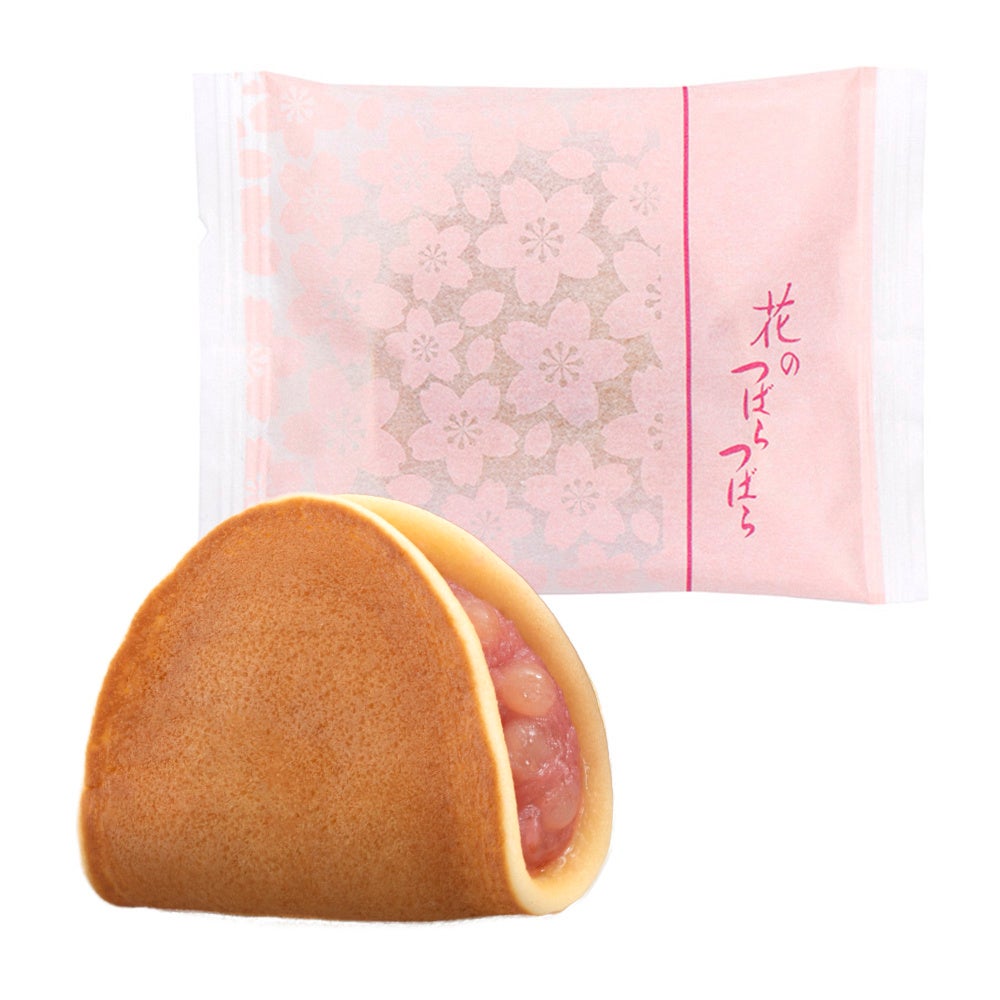 通年販売の「つばらつばら」は十勝産小豆の「小倉あん」のところ、春季限定の「花のつばらつばら」では岡山県産の「備中白小豆(びっちゅうしろあずき)」を使用した「つぶあん」を春らしい桜色に染めて包みました。もっちり・しっとり食感の焼皮に、あっさりとした上品な風味のあんがまろやかに調和した、春だけの優しい味わいをご賞味いただけます。