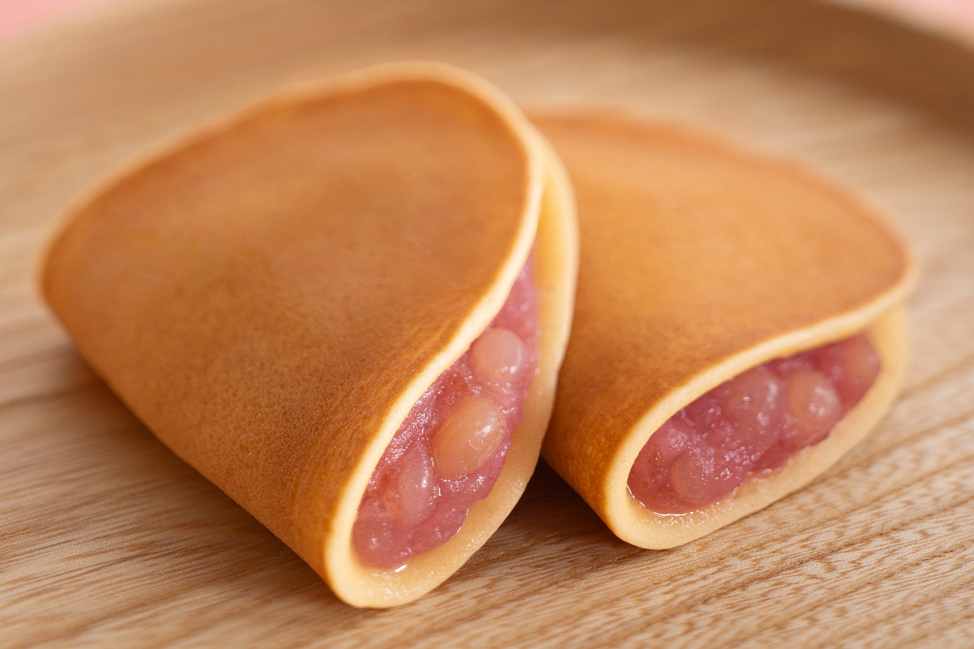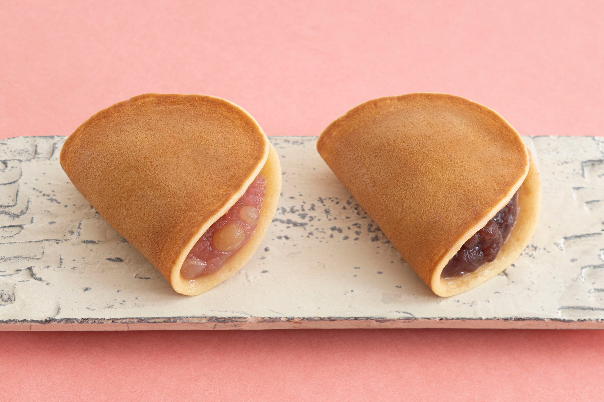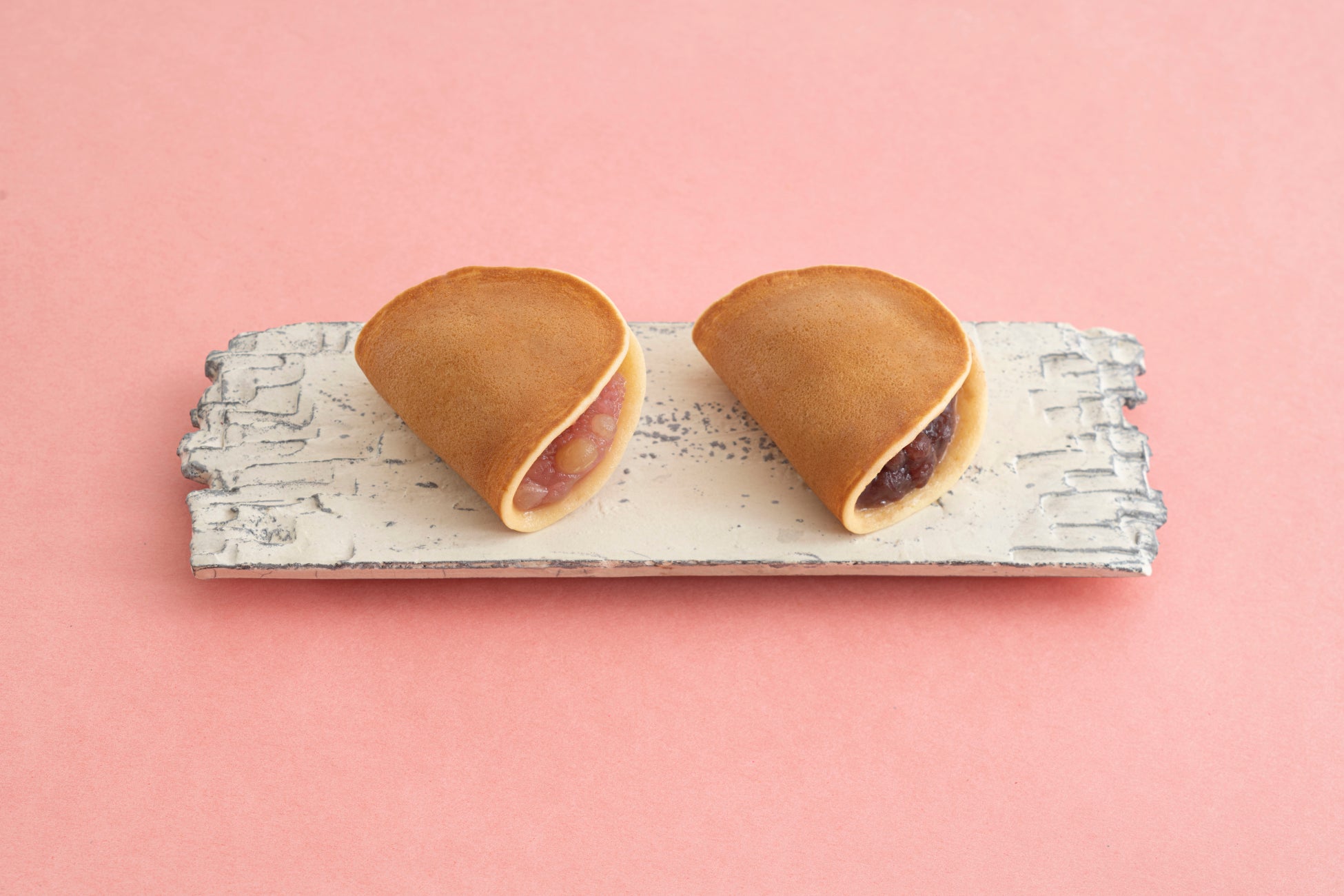 通年販売の「つばらつばら」は十勝産小豆の「小倉あん」のところ、春季限定の「花のつばらつばら」では岡山県産の「備中白小豆(びっちゅうしろあずき)」を使用した「つぶあん」を春らしい桜色に染めて包みました。もっちり・しっとり食感の焼皮に、あっさりとした上品な風味のあんがまろやかに調和した、春だけの優しい味わいをご賞味いただけます。