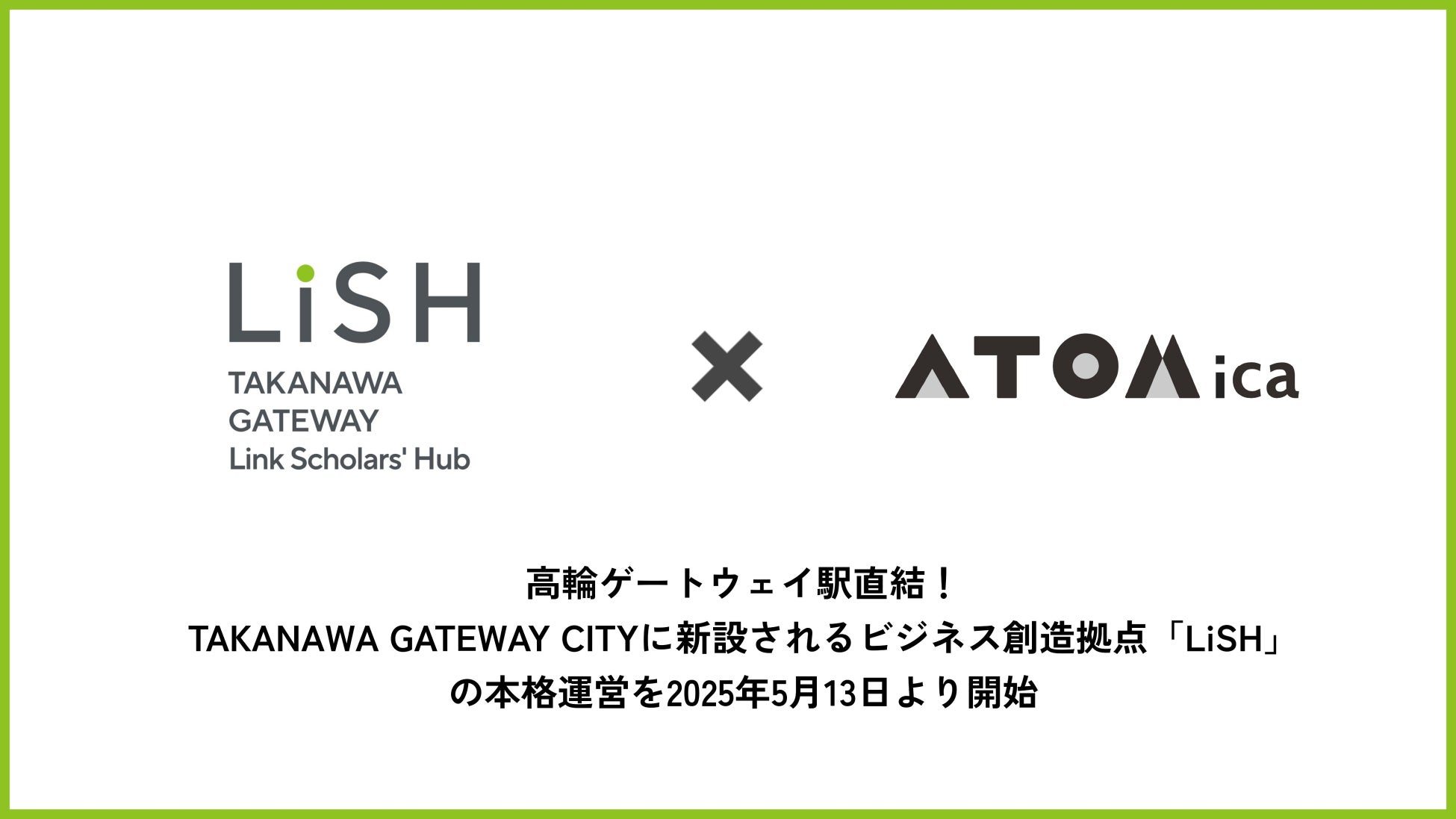ソーシャルコワーキング®︎スタートアップの株式会社ATOMica(本社:宮崎県宮崎市、代表取締役:嶋田 瑞生、南原 一輝、以下「ATOMica」)は、東日本旅客鉄道株式会社(本社:東京都渋谷区、代表取締役社長:喜㔟 陽一、以下「JR東日本」)が、TAKANAWA GATEWAY CITYに開設するビジネス創造拠点TAKANAWA GATEWAY Link Scholarsʼ Hub(以下「LiSH」)の運営パートナーとして2025年5月13日(火)より本格運営を開始します。