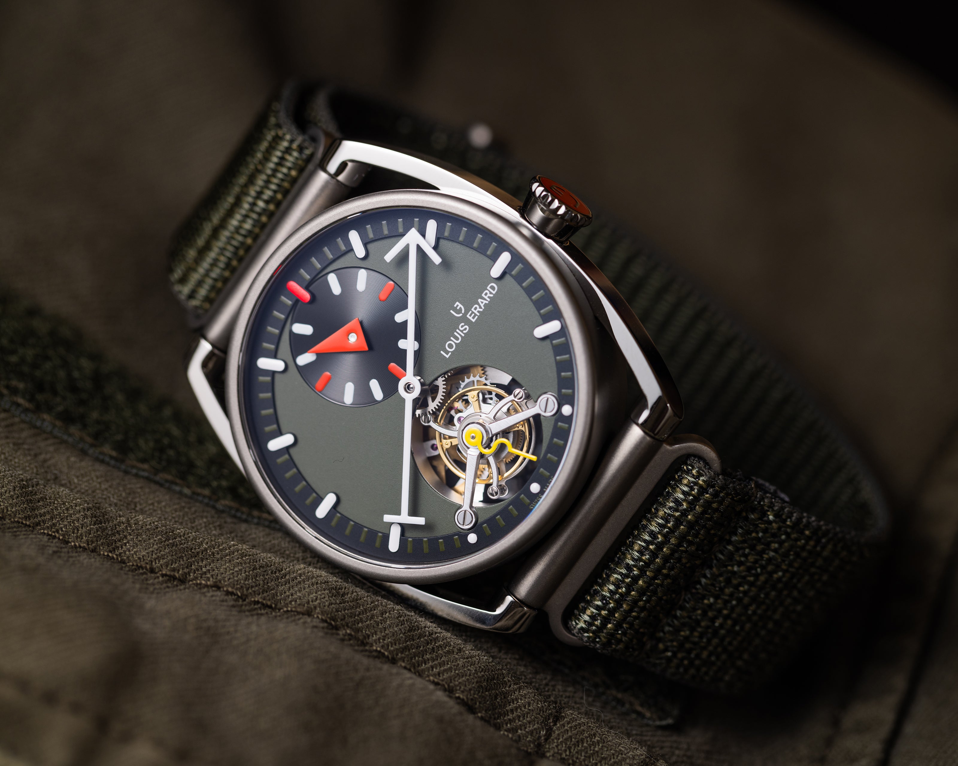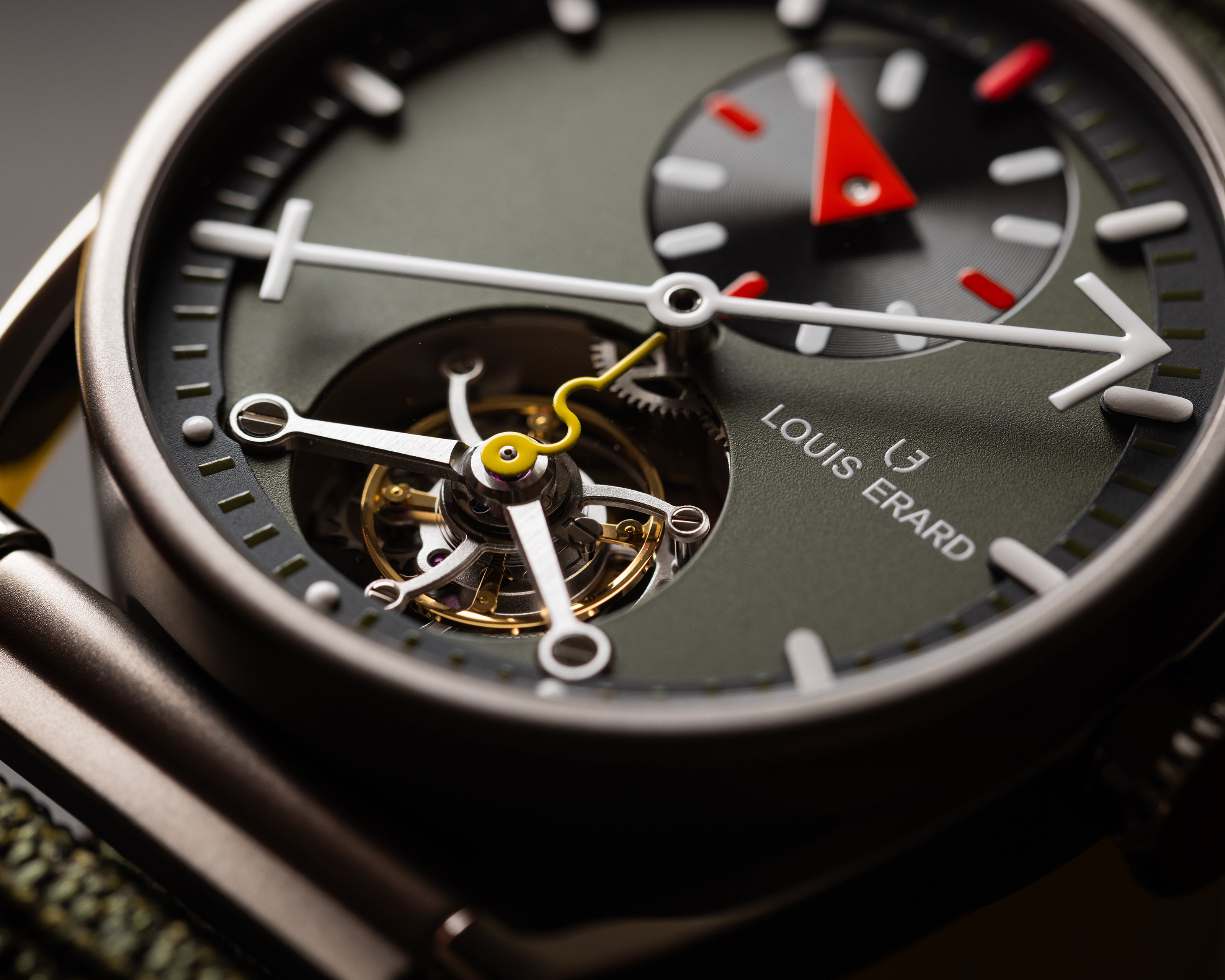 集大成となる今回のコラボレーションの最大の特徴は、ルイ・エラール、アラン・シルベスタインが共に敬意を払う、ブレゲにより発明された高級複雑機械式時計製造の頂点「トゥールビヨン」機構を搭載したモデルで、これはルイ・エラールブランドにとって初めての発表となります。この記念すべきトゥールビヨンの製造に関してはラ・ショー・ド・フォンにアトリエを構えるBCP Tourbillons 開発者であるオリビエ・モリに委ねられました。オリビエ・モリは、高精度時計製造で訓練を受けた後、高級時計製造に興味を持つようになった舞台裏の人物です。彼の手腕により、一般的に手の届かないトゥールビヨン機構搭載の複雑機械式時計を、アクセシブル(手の届く)価格の高級時計として実現しました。カーキカラーで統一されたこのトリプティックセットは、プレイフルなアラン・シルベスタインの哲学、ルイ・エラールのC E O マニュエル・エムシュが掲げるアーティスティックでスタイリッシュなデザイン、そして、ブランドのコンセプトである、コレクタブルでアフォーダブルといった要素、そして、「Together we are always stronger」というルイ・エラールのモットーが凝縮されています。