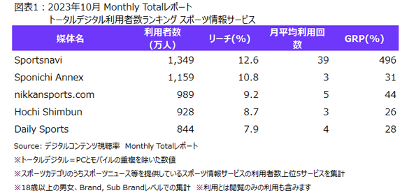 2023年10月のニールセン デジタルコンテンツ視聴率 Monthly Totalレポートによると、スポーツニュース等を提供しているスポーツ情報サービスのうち、PCとモバイルの重複を除いたトータルデジタルの利用者数が最も多かったのは「Sportsnavi」で1,349万人が利用しており、「Sponichi Annex」が1,159万人で続いていました。また、GRPでは、「Sportsnavi」が496%と最も高く、「nikkansports.com」が44%で続いていました(図表1)。
