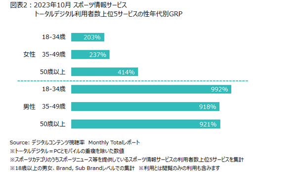 次に、スポーツ情報サービスにおける利用者数上位5サイトを合計したターゲットGRP(TARP)を性年代別に見ると、男性18-34歳が最も高く992%となっていました。次いで男性50歳以上で921%となり、どの年代でも女性よりも男性のほうが高くなっていました(図表2)。