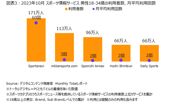 - 男性18-34歳の平均利用回数は「Sportsnavi」が最も多く月60回